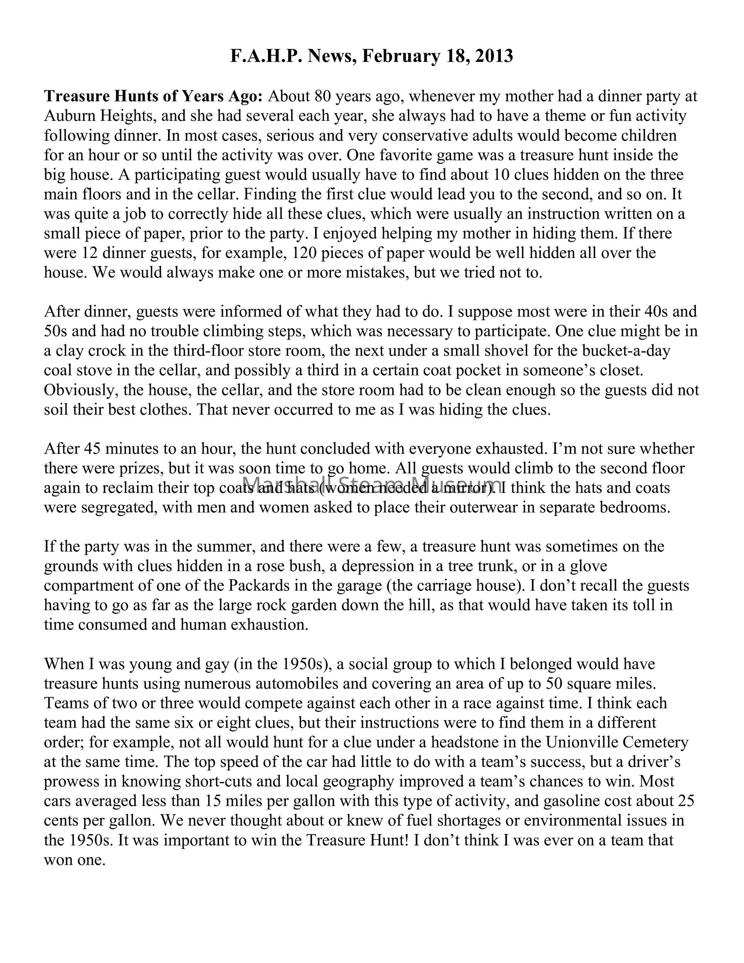 Treasure Hunts of Years Ago: About 80 years ago, whenever my mother had a dinner party at Auburn Heights, and she had several each year, she always had to have a theme or fun activity following dinner. In most cases, serious and very conservative adults would become children for an hour or so until the activity was over. One favorite game was a treasure hunt inside the big house. A participating guest would usually have to find about 10 clues hidden on the three main floors and in the cellar. Finding the first clue would lead you to the second, and so on. It was quite a job to correctly hide all these clues, which were usually an instruction written on a small piece of paper, prior to the party. I enjoyed helping my mother in hiding them. If there were 12 dinner guests, for example, 120 pieces of paper would be well hidden all over the house. We would always make one or more mistakes, but we tried not to.
