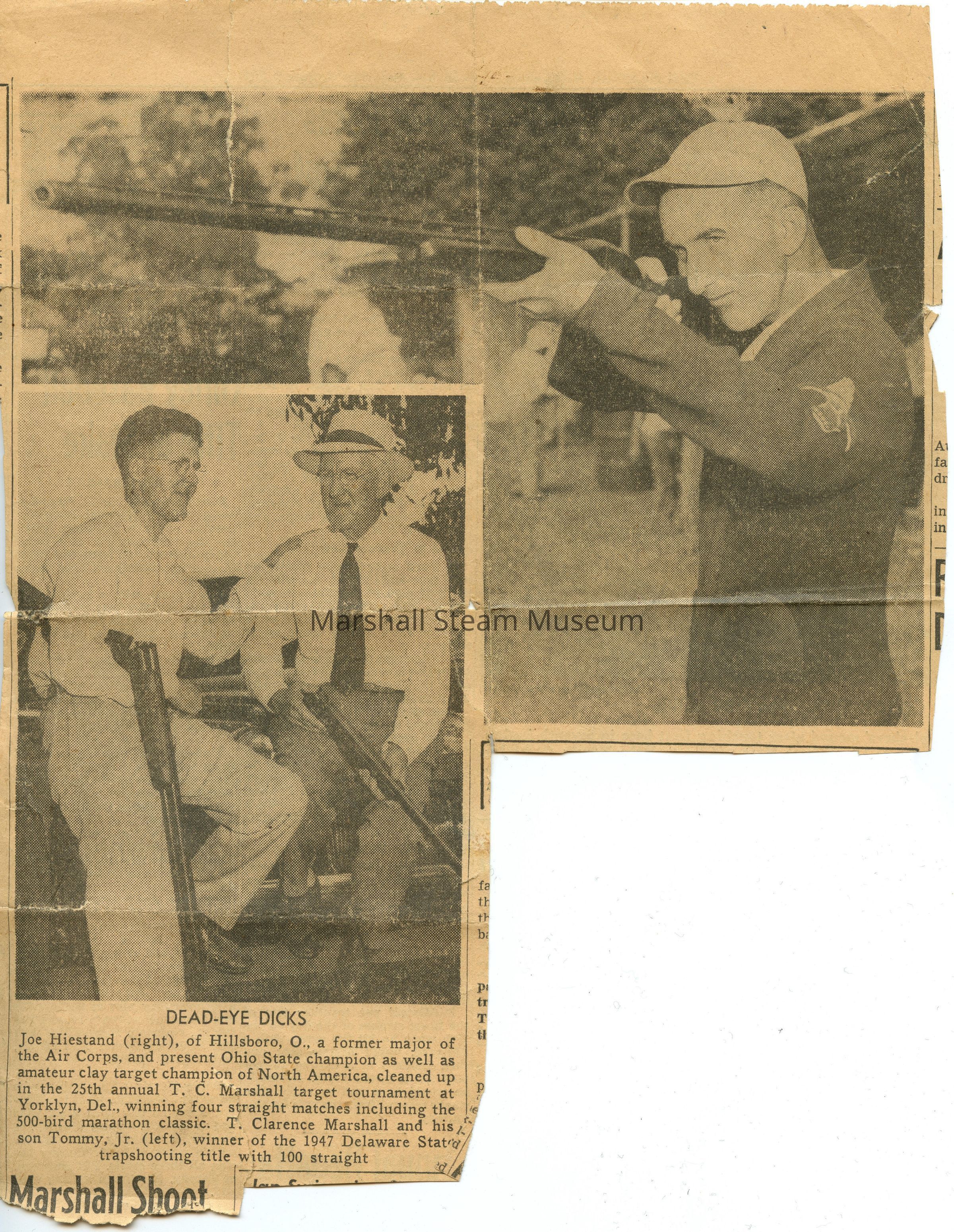 Newspaper clipping of T Clarence Marshall (middle), son Tom Marshall (far left), and Joe Heistand (right) Trapshooting