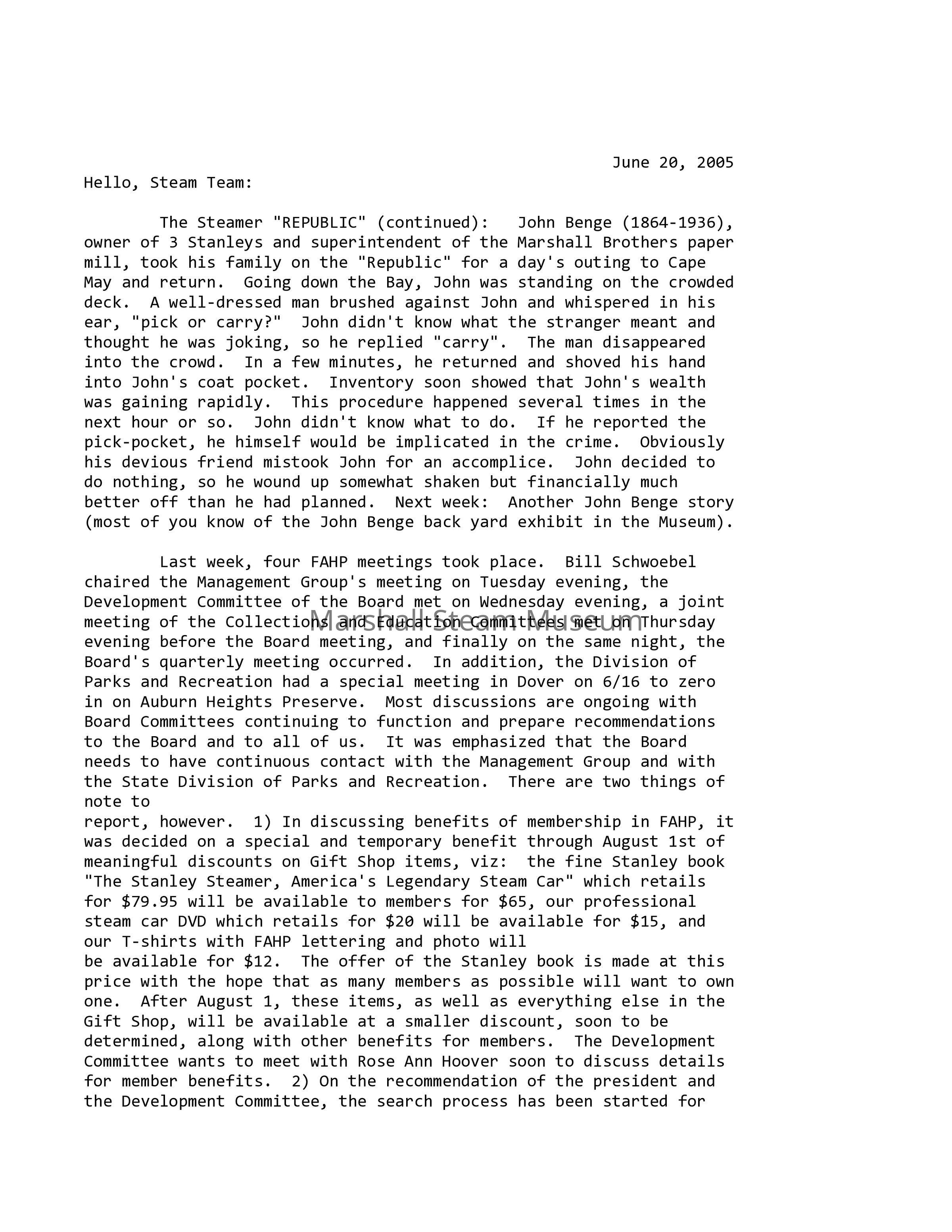 Last week, four FAHP meetings took place. Bill Schwoebel chaired the Management Group's meeting on Tuesday evening, the Development Committee of the Board met on Wednesday evening, a joint meeting of the Collections and Education Committees met on Thursday evening before the Board meeting, and finally on the same night, the Board's quarterly meeting occurred. In addition, the Division of Parks and Recreation had a special meeting in Dover on 6/16 to zero in on Auburn Heights Preserve. Most discussions are ongoing with Board Committees continuing to function and prepare recommendations to the Board and to all of us. It was emphasized that the Board needs to have continuous contact with the Management Group and with the State Division of Parks and Recreation. There are two things of note to report, however. 1) In discussing benefits of membership in FAHP, it was decided on a special and temporary benefit through August 1st of meaningful discounts on Gift Shop items, viz: the fine Stanley book "The Stanley Steamer, America's Legendary Steam Car" which retails for $79.95 will be available to members for $65, our professional steam car DVD which retails for $20 will be available for $15, and our T-shirts with FAHP lettering and photo will be available for $12. The offer of the Stanley book is made at this price with the hope that as many members as possible will want to own one. After August 1, these items, as well as everything else in the Gift Shop, will be available at a smaller discount, soon to be determined, along with other benefits for members. The Development Committee wants to meet with Rose Ann Hoover soon to discuss details for member benefits. 2) On the recommendation of the president and the Development Committee, the search process has been started for the position of a paid Executive Director. An ad hoc committee consisting of Dan Muir, Emil Christofano, Jerry Novak and myself has been appointed to explore a job description and consider candidates with the hope that such a person might be in place by the beginning of 2006. The Management Group approved its Events Committee's recommendation to have a Special Rides ticket available for those who want extra rides (usually the train ride) which will sell for $4 allowing two extra rides. This will be available at the Gift Shop as well as at the Ticket Office. Credit Cards will be accepted for everything on June 26.