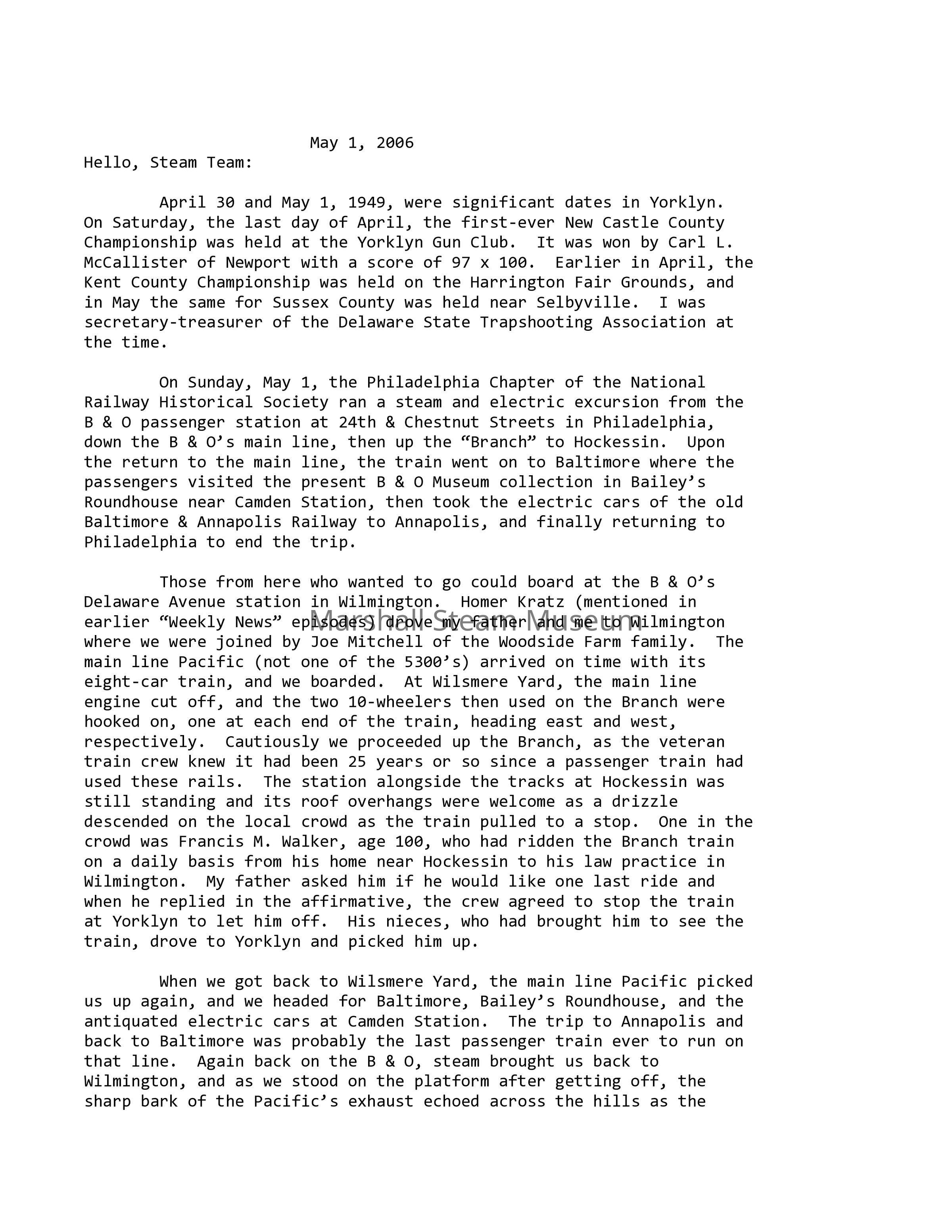 Those from here who wanted to go could board at the B & O’s Delaware Avenue station in Wilmington. Homer Kratz (mentioned in earlier “Weekly News” episodes) drove my father and me to Wilmington where we were joined by Joe Mitchell of the Woodside Farm family. The main line Pacific (not one of the 5300’s) arrived on time with its eight-car train, and we boarded. At Wilsmere Yard, the main line engine cut off, and the two 10-wheelers then used on the Branch were hooked on, one at each end of the train, heading east and west, respectively. Cautiously we proceeded up the Branch, as the veteran train crew knew it had been 25 years or so since a passenger train had used these rails. The station alongside the tracks at Hockessin was still standing and its roof overhangs were welcome as a drizzle descended on the local crowd as the train pulled to a stop. One in the crowd was Francis M. Walker, age 100, who had ridden the Branch train on a daily basis from his home near Hockessin to his law practice in Wilmington. My father asked him if he would like one last ride and when he replied in the affirmative, the crew agreed to stop the train at Yorklyn to let him off. His nieces, who had brought him to see the train, drove to Yorklyn and picked him up.
