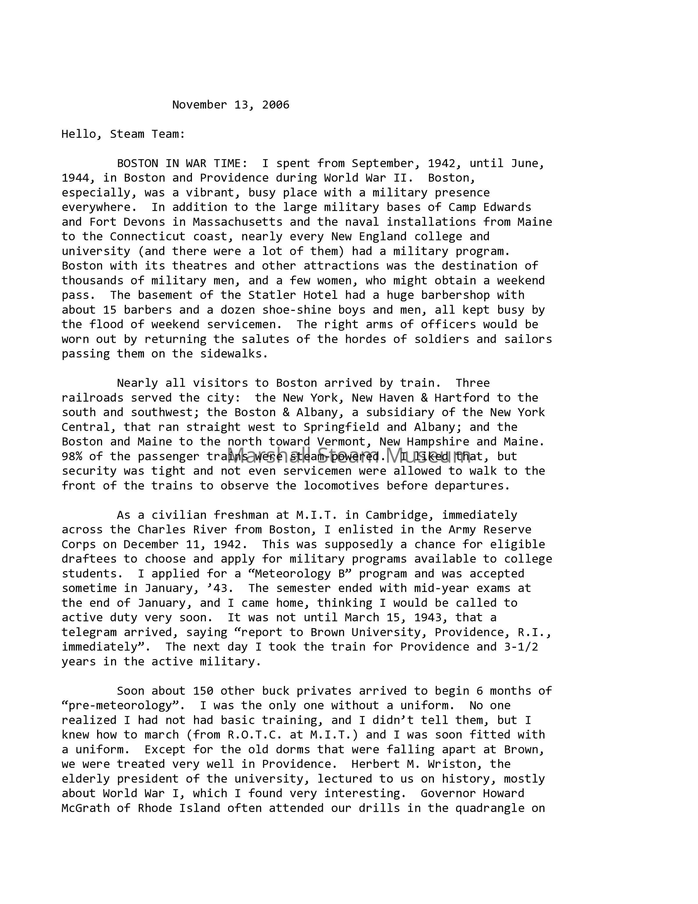 Soon about 150 other buck privates arrived to begin 6 months of “pre-meteorology”. I was the only one without a uniform. No one realized I had not had basic training, and I didn’t tell them, but I knew how to march (from R.O.T.C. at M.I.T.) and I was soon fitted with a uniform. Except for the old dorms that were falling apart at Brown, we were treated very well in Providence. Herbert M. Wriston, the elderly president of the university, lectured to us on history, mostly about World War I, which I found very interesting. Governor Howard McGrath of Rhode Island often attended our drills in the quadrangle on the Brown campus. After classes each day we marched all over the city singing mostly World War I songs like “Over There”, but including a new one “Remember Pearl Harbor”. Each unit or “flight” even had a softball team, and a few times we took the train to Boston on a Saturday afternoon to attend a ball game at Fenway Park or an open-air concert by the Boston Pops on the Esplanade. Several classmates from the Philadelphia area and I came home on 3 or 4 weekends during our Providence spring and summer. The “weekend” started at 1:00 P.M. Saturday, and ended at bedtime Sunday night. We always hoped the trains would be on time, and we made record time by cab and on foot from Grand Central to Penn Station in New York to catch our connecting train.