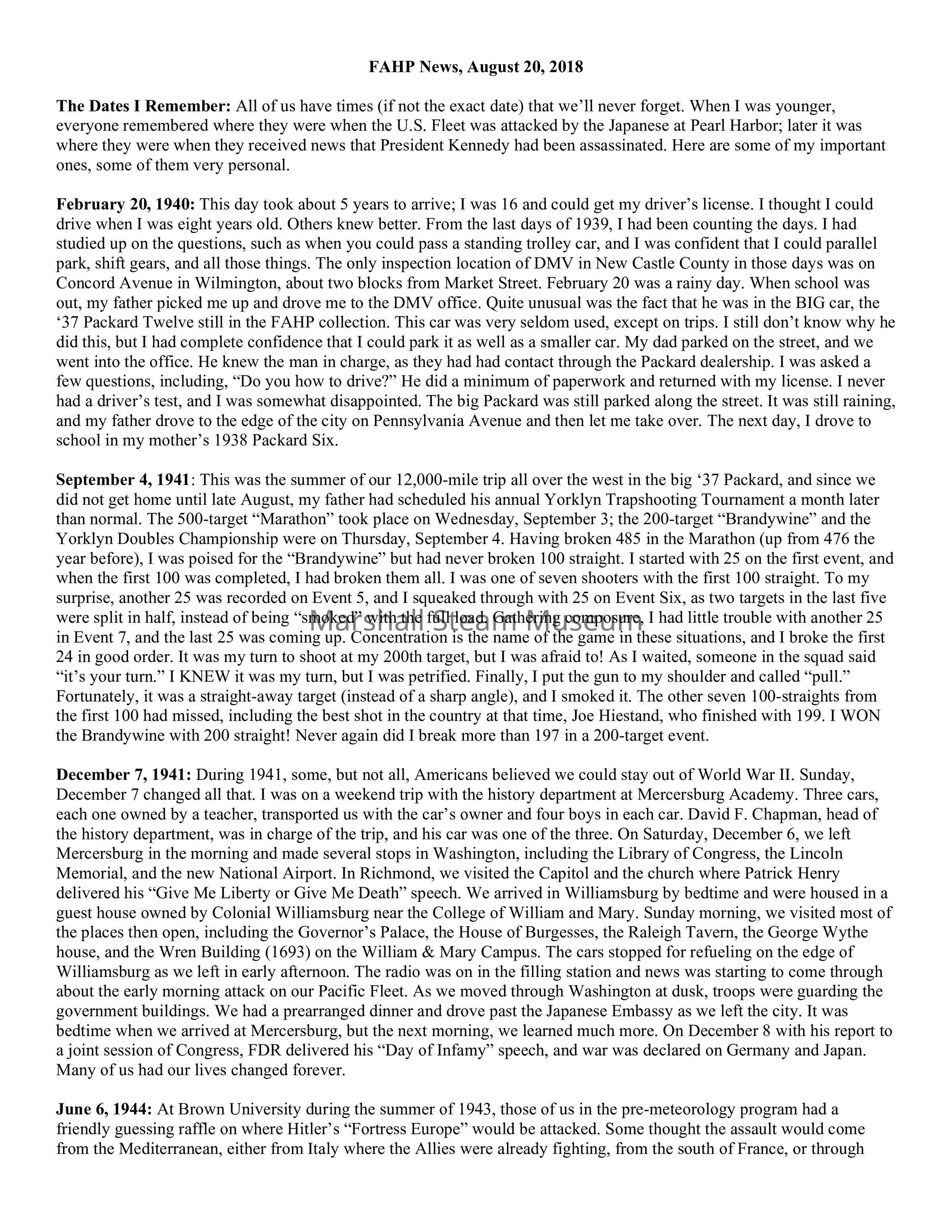 February 20, 1940: This day took about 5 years to arrive; I was 16 and could get my driver’s license. I thought I could drive when I was eight years old. Others knew better. From the last days of 1939, I had been counting the days. I had studied up on the questions, such as when you could pass a standing trolley car, and I was confident that I could parallel park, shift gears, and all those things. The only inspection location of DMV in New Castle County in those days was on Concord Avenue in Wilmington, about two blocks from Market Street. February 20 was a rainy day. When school was out, my father picked me up and drove me to the DMV office. Quite unusual was the fact that he was in the BIG car, the ‘37 Packard Twelve still in the FAHP collection. This car was very seldom used, except on trips. I still don’t know why he did this, but I had complete confidence that I could park it as well as a smaller car. My dad parked on the street, and we went into the office. He knew the man in charge, as they had had contact through the Packard dealership. I was asked a few questions, including, “Do you how to drive?” He did a minimum of paperwork and returned with my license. I never had a driver’s test, and I was somewhat disappointed. The big Packard was still parked along the street. It was still raining, and my father drove to the edge of the city on Pennsylvania Avenue and then let me take over. The next day, I drove to school in my mother’s 1938 Packard Six.