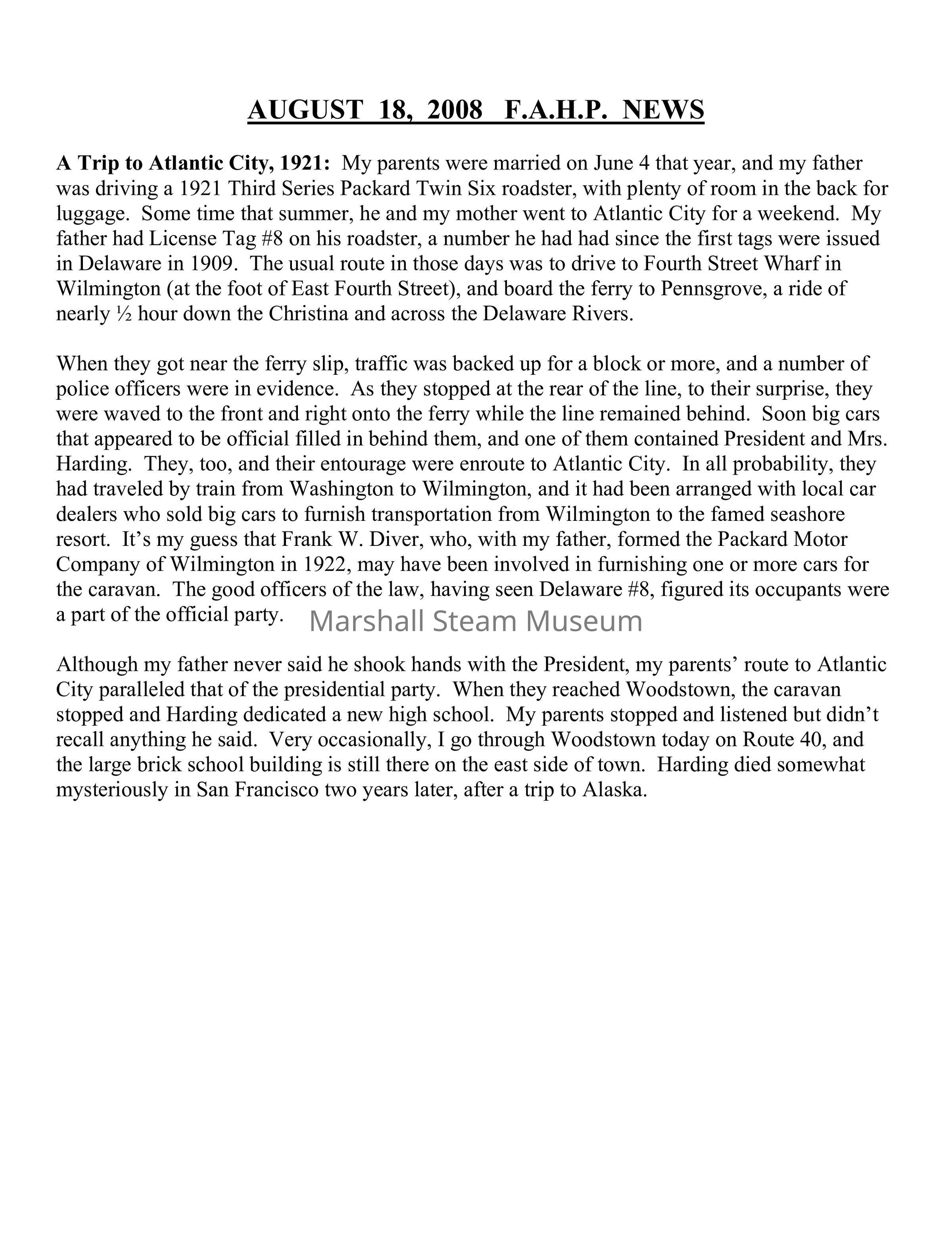 When they got near the ferry slip, traffic was backed up for a block or more, and a number of police officers were in evidence. As they stopped at the rear of the line, to their surprise, they were waved to the front and right onto the ferry while the line remained behind. Soon big cars that appeared to be official filled in behind them, and one of them contained President and Mrs. Harding. They, too, and their entourage were enroute to Atlantic City. In all probability, they had traveled by train from Washington to Wilmington, and it had been arranged with local car dealers who sold big cars to furnish transportation from Wilmington to the famed seashore resort. It’s my guess that Frank W. Diver, who, with my father, formed the Packard Motor Company of Wilmington in 1922, may have been involved in furnishing one or more cars for the caravan. The good officers of the law, having seen Delaware #8, figured its occupants were a part of the official party.