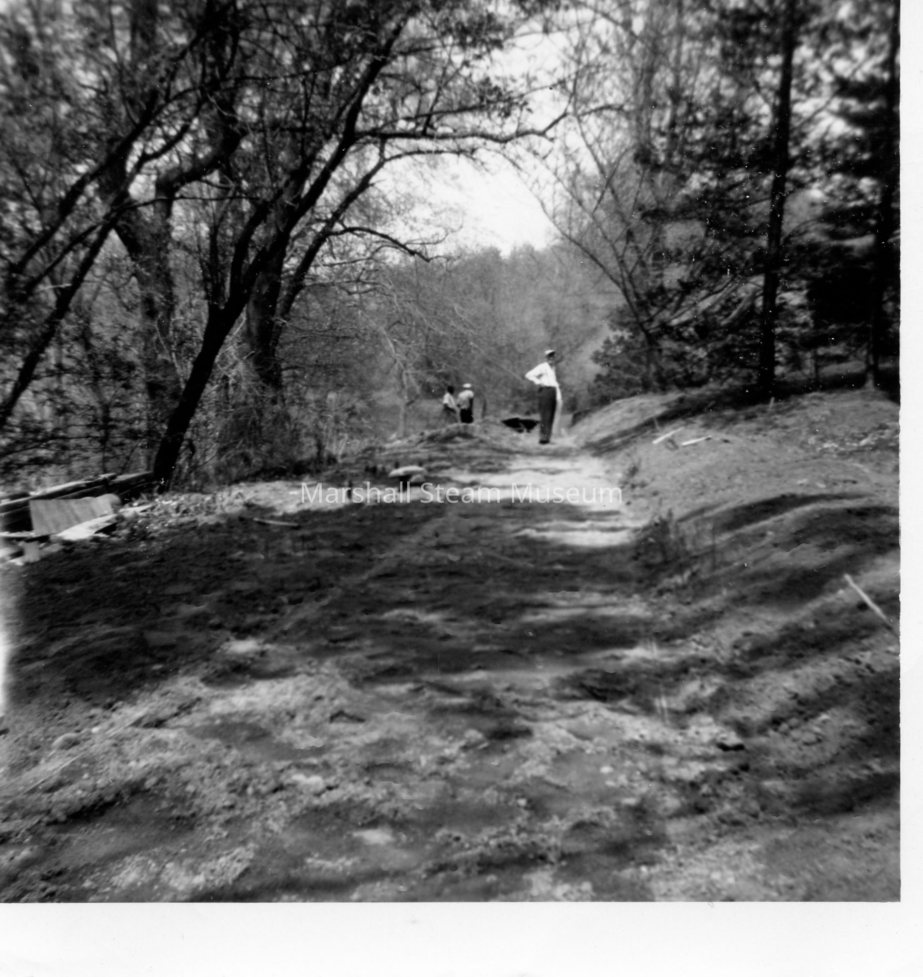Backwriting: "Looking from the turntable pit, Clarence Marshall is shown surveying the new right-of-way near the present spillway from the pond, May 1960"Photograph Details