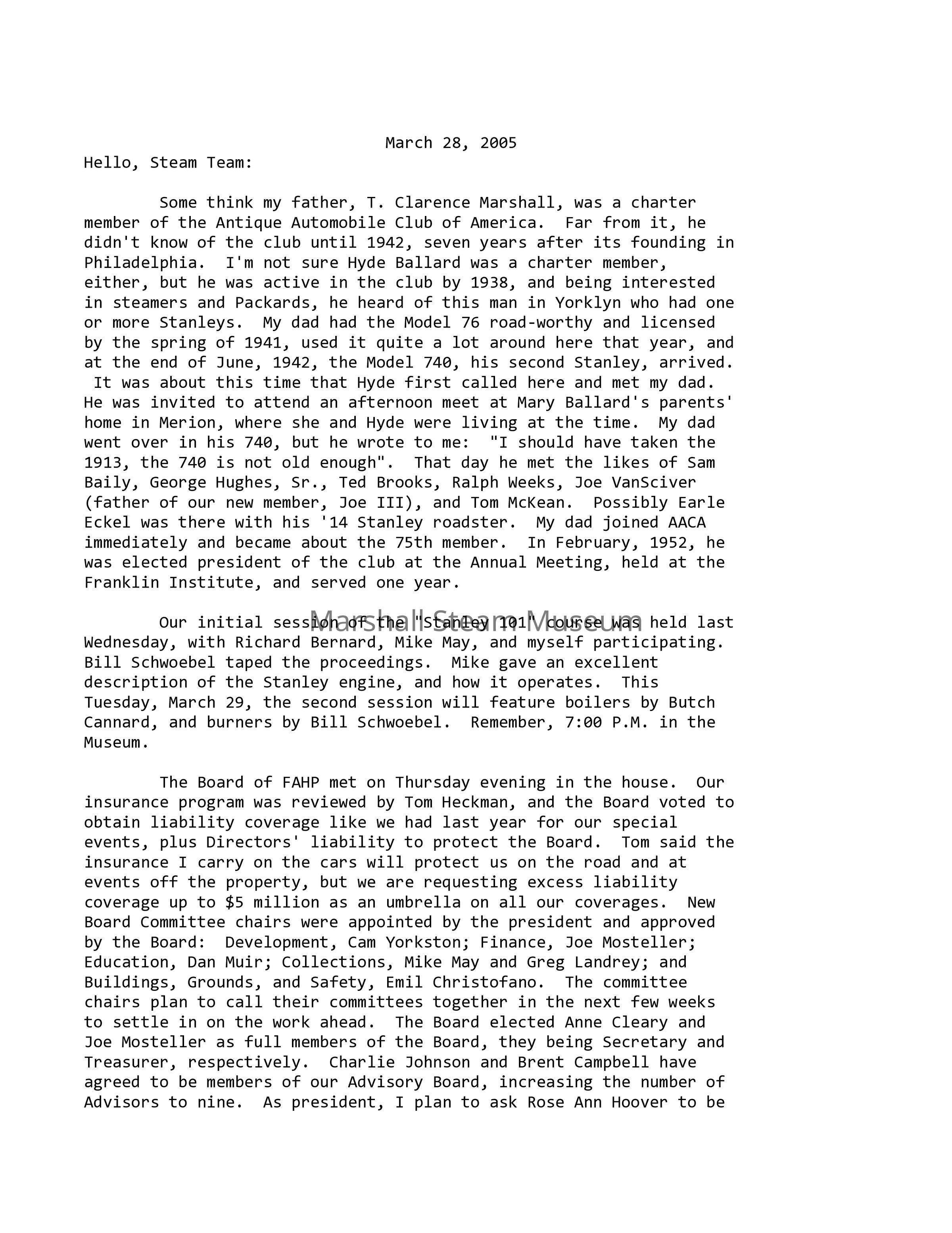 Some think my father, T. Clarence Marshall, was a charter member of the Antique Automobile Club of America. Far from it, he didn't know of the club until 1942, seven years after its founding in Philadelphia. I'm not sure Hyde Ballard was a charter member, either, but he was active in the club by 1938, and being interested in steamers and Packards, he heard of this man in Yorklyn who had one or more Stanleys. My dad had the Model 76 road-worthy and licensed by the spring of 1941, used it quite a lot around here that year, and at the end of June, 1942, the Model 740, his second Stanley, arrived. It was about this time that Hyde first called here and met my dad. He was invited to attend an afternoon meet at Mary Ballard's parents' home in Merion, where she and Hyde were living at the time. My dad went over in his 740, but he wrote to me: "I should have taken the 1913, the 740 is not old enough". That day he met the likes of Sam Baily, George Hughes, Sr., Ted Brooks, Ralph Weeks, Joe VanSciver (father of our new member, Joe III), and Tom McKean. Possibly Earle Eckel was there with his '14 Stanley roadster. My dad joined AACA immediately and became about the 75th member. In February, 1952, he was elected president of the club at the Annual Meeting, held at the Franklin Institute, and served one year.