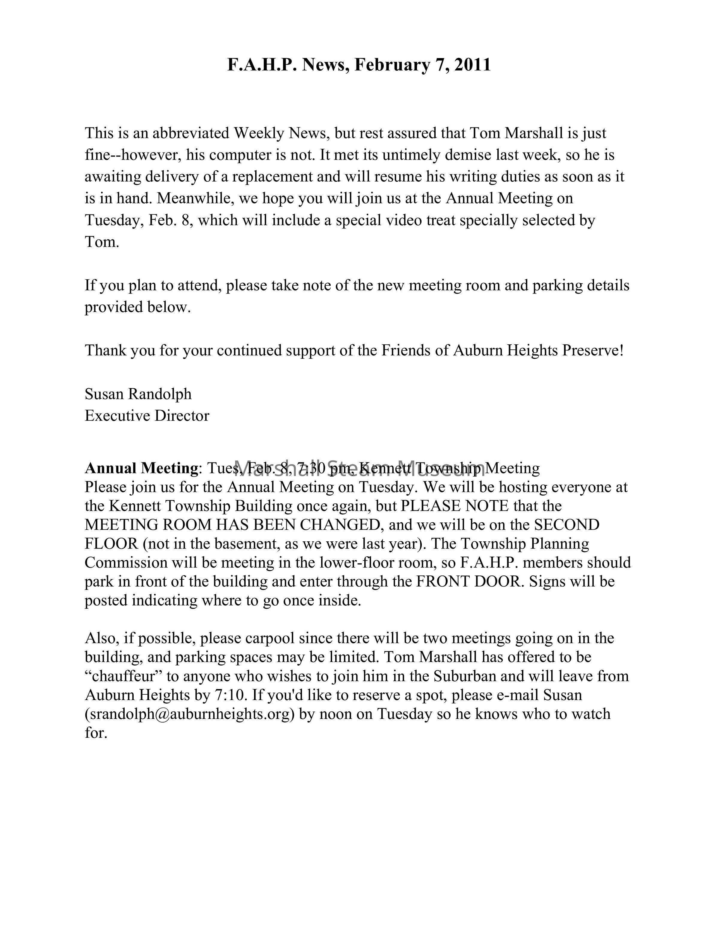 Please join us for the Annual Meeting on Tuesday. We will be hosting everyone at the Kennett Township Building once again, but PLEASE NOTE that the MEETING ROOM HAS BEEN CHANGED, and we will be on the SECOND FLOOR (not in the basement, as we were last year). The Township Planning Commission will be meeting in the lower-floor room, so F.A.H.P. members should park in front of the building and enter through the FRONT DOOR. Signs will be posted indicating where to go once inside.