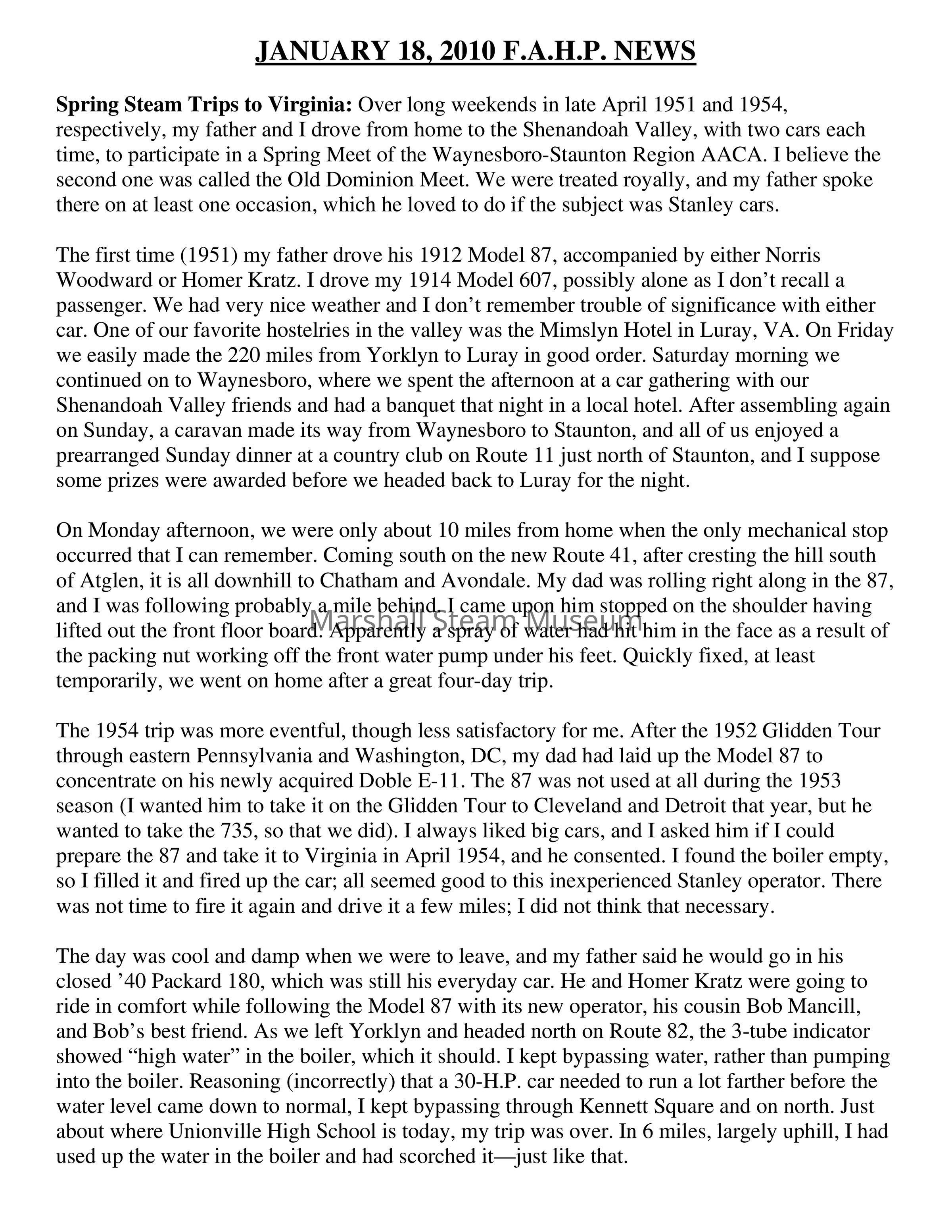 Spring Steam Trips to Virginia: Over long weekends in late April 1951 and 1954, respectively, my father and I drove from home to the Shenandoah Valley, with two cars each time, to participate in a Spring Meet of the Waynesboro-Staunton Region AACA. I believe the second one was called the Old Dominion Meet. We were treated royally, and my father spoke there on at least one occasion, which he loved to do if the subject was Stanley cars.