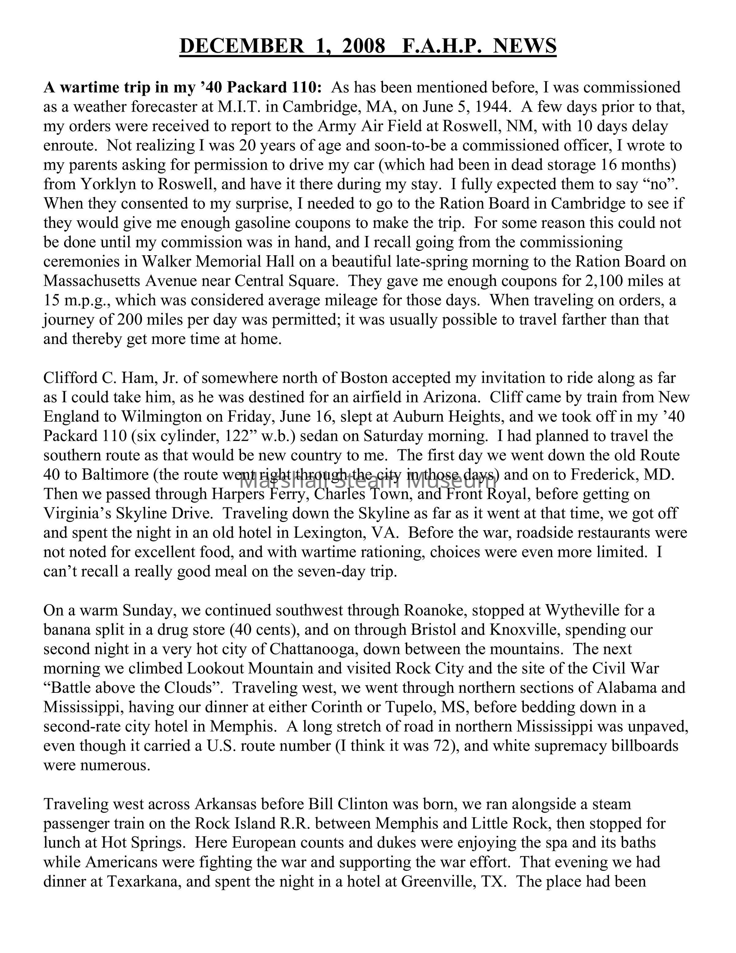 Traveling west across Arkansas before Bill Clinton was born, we ran alongside a steam passenger train on the Rock Island R.R. between Memphis and Little Rock, then stopped for lunch at Hot Springs. Here European counts and dukes were enjoying the spa and its baths while Americans were fighting the war and supporting the war effort. That evening we had dinner at Texarkana, and spent the night in a hotel at Greenville, TX. The place had been recommended by Duncan Hines, but it was not good, and I wrote the Hines organization, telling them it should be removed from their directory. They replied that it had already been deleted. Cliff Ham wanted to visit a friend at Love Field, just north of Dallas, so we made a brief stop before having lunch in the R.R. station at Fort Worth. The hot wind from the south burned the driver’s left arm as our car continued to Abilene, TX, where my cousins, the Mancill twins, were undergoing the last stages of overseas training. One of them was on an overnight bivouac and the other on KP, so we slept in their bunks until 5 A.M. The next morning, now Thursday, Cliff took a bus westward toward his Arizona destination, and Alan Mancill and I went to the movies in Abilene, before I said good-by in the afternoon and drove the 40 miles to Sweetwater where I spent the last night on the road. Stopping at a tiny store near Tatum, NM, the proprietor drove up in his old pick-up truck and asked if I would take a short ride with him, and I obliged. He told me his son had just been killed in Europe and he needed a service man to talk to. Arriving in Roswell late that afternoon, I spent the first night at the Nickson Hotel before checking in at the air base the next morning. I had covered 2,140 miles in 7 days, and although the 35 m.p.h. wartime speed limit was enforced in some places in the East, no one paid much attention to it for most of our trip. There was virtually no traffic, and the small Packard cruised nicely at 50-55 m.p.h., but barely averaged 15 m.p.g. Gasoline was about 20 cents per gallon.