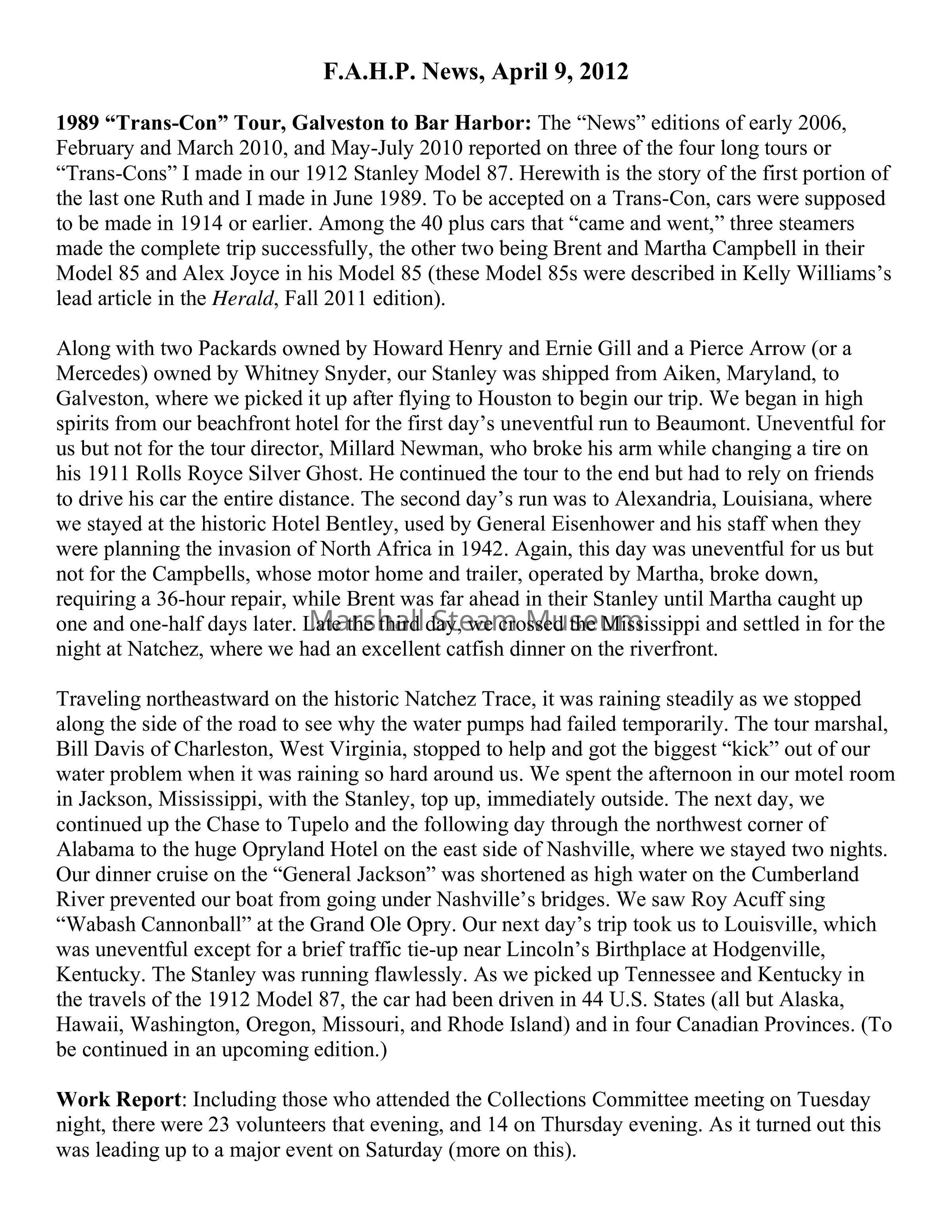 1989 “Trans-Con” Tour, Galveston to Bar Harbor: The “News” editions of early 2006, February and March 2010, and May-July 2010 reported on three of the four long tours or “Trans-Cons” I made in our 1912 Stanley Model 87. Herewith is the story of the first portion of the last one Ruth and I made in June 1989. To be accepted on a Trans-Con, cars were supposed to be made in 1914 or earlier. Among the 40 plus cars that “came and went,” three steamers made the complete trip successfully, the other two being Brent and Martha Campbell in their Model 85 and Alex Joyce in his Model 85 (these Model 85s were described in Kelly Williams’s lead article in the Herald, Fall 2011 edition).