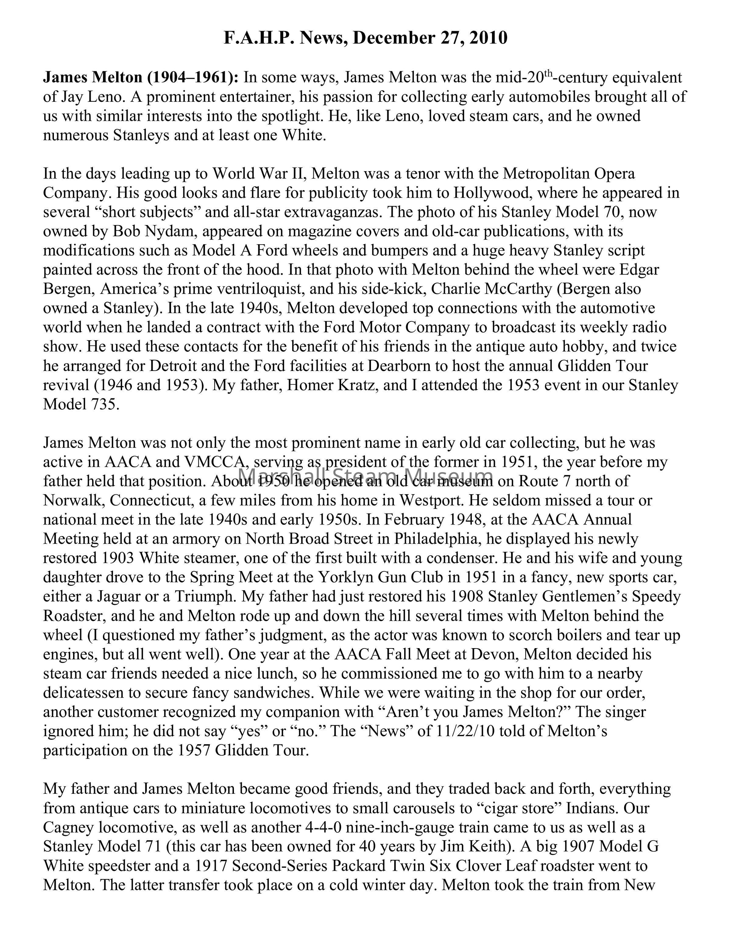 James Melton (1904–1961): In some ways, James Melton was the mid-20th-century equivalent of Jay Leno. A prominent entertainer, his passion for collecting early automobiles brought all of us with similar interests into the spotlight. He, like Leno, loved steam cars, and he owned numerous Stanleys and at least one White.