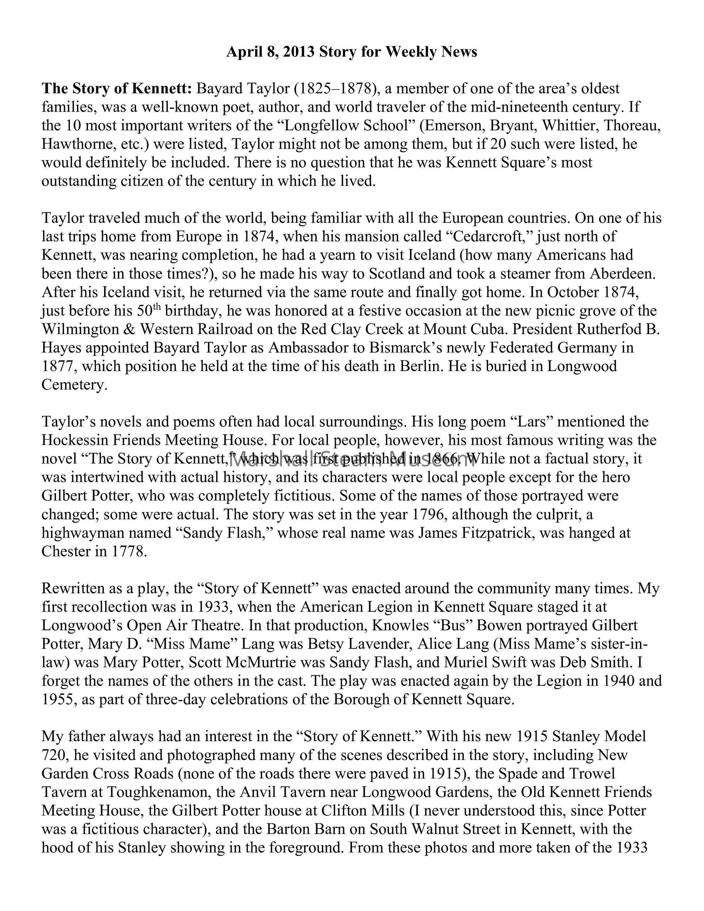The Story of Kennett: Bayard Taylor (1825–1878), a member of one of the area’s oldest families, was a well-known poet, author, and world traveler of the mid-nineteenth century. If the 10 most important writers of the “Longfellow School” (Emerson, Bryant, Whittier, Thoreau, Hawthorne, etc.) were listed, Taylor might not be among them, but if 20 such were listed, he would definitely be included. There is no question that he was Kennett Square’s most outstanding citizen of the century in which he lived.