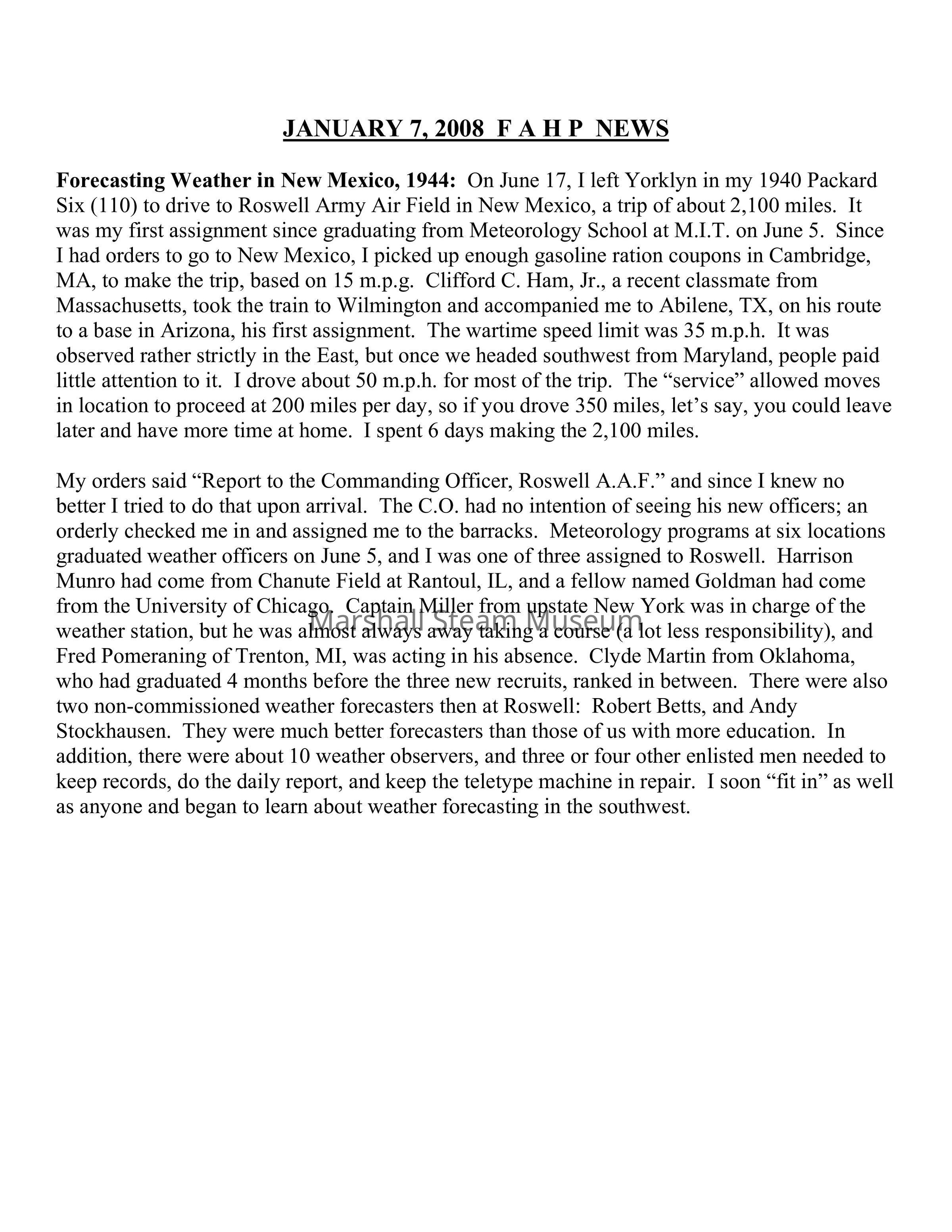 Forecasting Weather in New Mexico, 1944: On June 17, I left Yorklyn in my 1940 Packard Six (110) to drive to Roswell Army Air Field in New Mexico, a trip of about 2,100 miles. It was my first assignment since graduating from Meteorology School at M.I.T. on June 5. Since I had orders to go to New Mexico, I picked up enough gasoline ration coupons in Cambridge, MA, to make the trip, based on 15 m.p.g. Clifford C. Ham, Jr., a recent classmate from Massachusetts, took the train to Wilmington and accompanied me to Abilene, TX, on his route to a base in Arizona, his first assignment. The wartime speed limit was 35 m.p.h. It was observed rather strictly in the East, but once we headed southwest from Maryland, people paid little attention to it. I drove about 50 m.p.h. for most of the trip. The “service” allowed moves in location to proceed at 200 miles per day, so if you drove 350 miles, let’s say, you could leave later and have more time at home. I spent 6 days making the 2,100 miles.