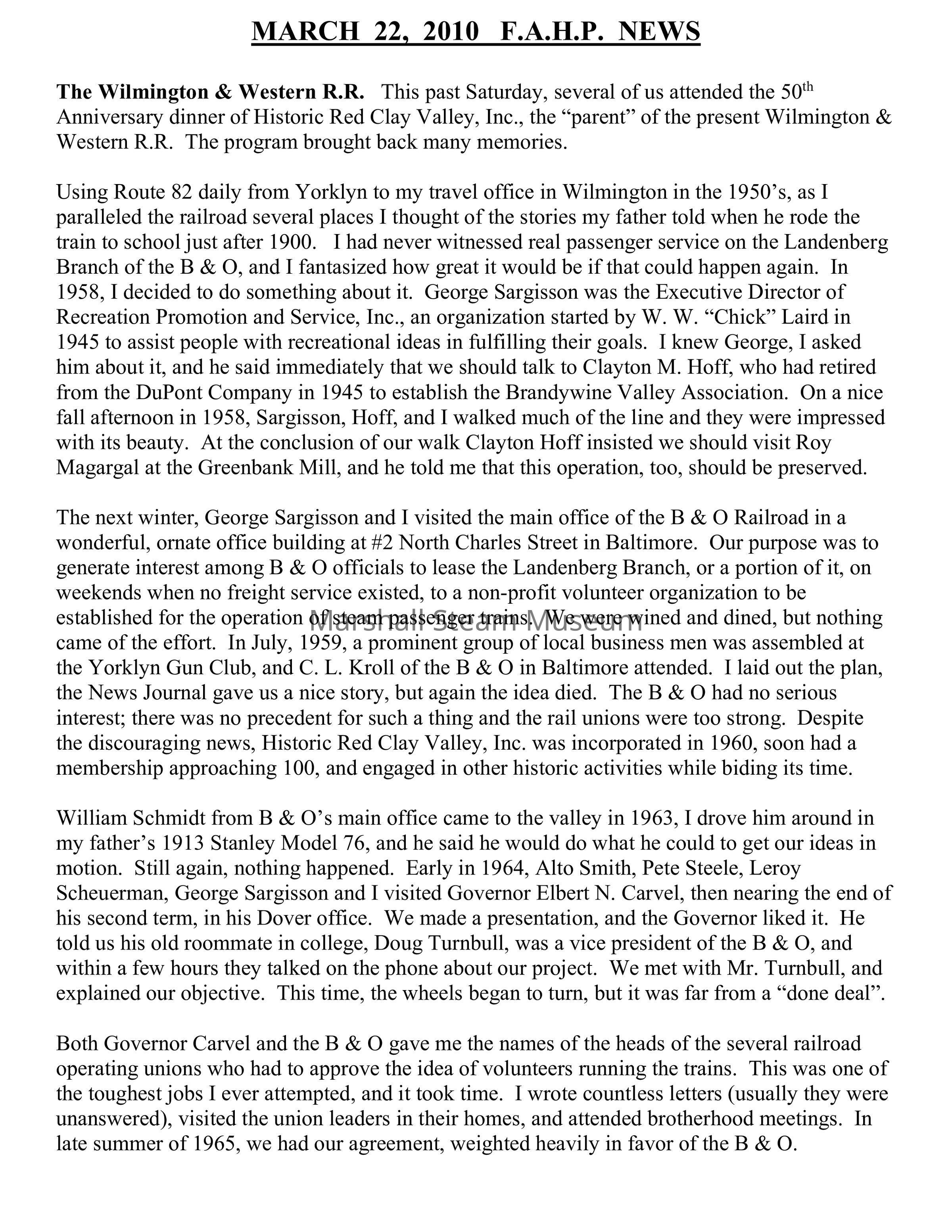 William Schmidt from B & O’s main office came to the valley in 1963, I drove him around in my father’s 1913 Stanley Model 76, and he said he would do what he could to get our ideas in motion. Still again, nothing happened. Early in 1964, Alto Smith, Pete Steele, Leroy Scheuerman, George Sargisson and I visited Governor Elbert N. Carvel, then nearing the end of his second term, in his Dover office. We made a presentation, and the Governor liked it. He told us his old roommate in college, Doug Turnbull, was a vice president of the B & O, and within a few hours they talked on the phone about our project. We met with Mr. Turnbull, and explained our objective. This time, the wheels began to turn, but it was far from a “done deal”.