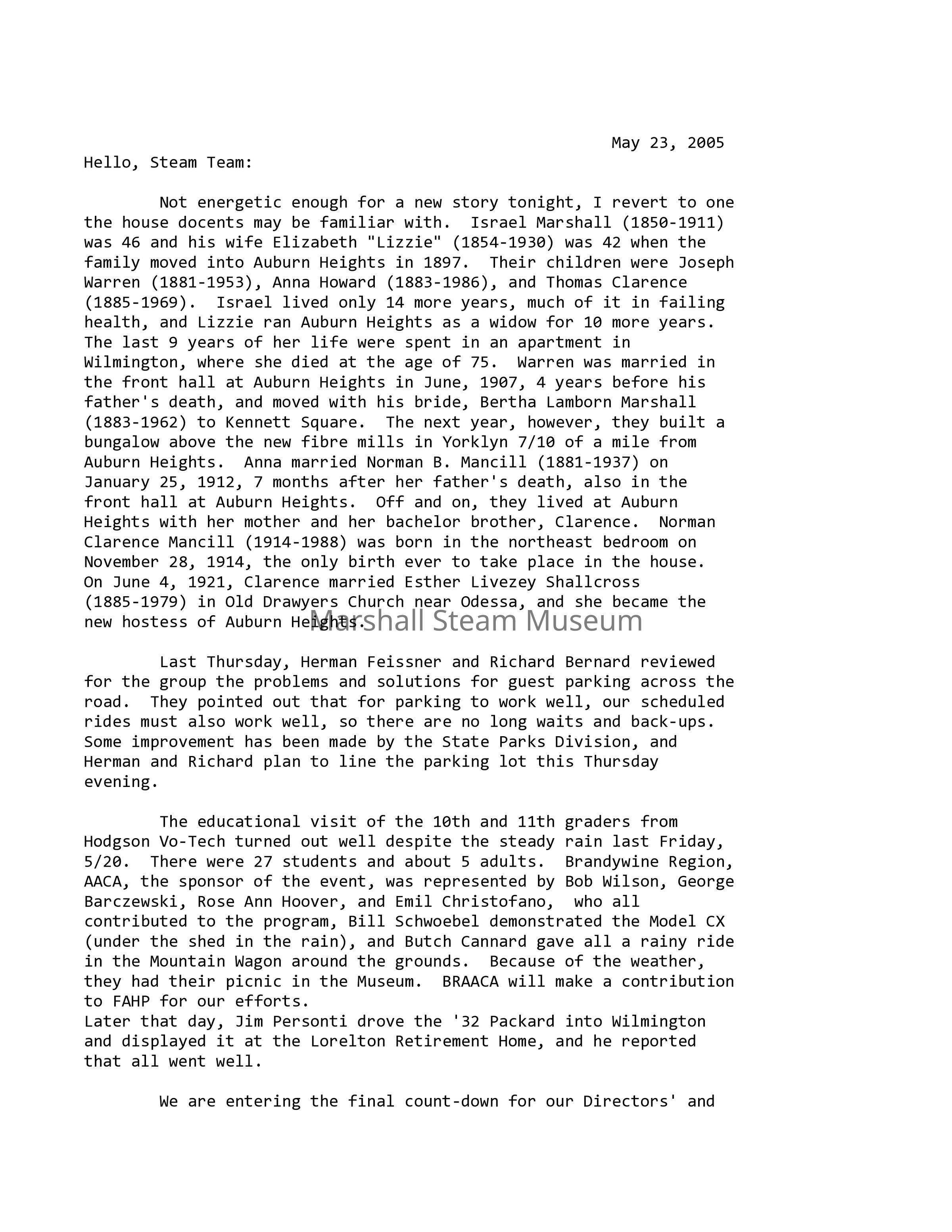 Jim Mitchell of Woodside Farm Creamery will be here on Sunday with his ice cream trailer, and we'd like to plan a return visit as an "Ice Cream Run" on Thursday evening, June 23. Jerry Novak expressed interest in the Memorial Day Parade in Kennett Square on May 30 (with one of the Packards), and we hope there will be others. Mike May and Bob Reilly and their wives plan to be with us for this week's meetings and festivities, and perhaps they'd like to drive two steamers if we're not all exhausted after Sunday.
