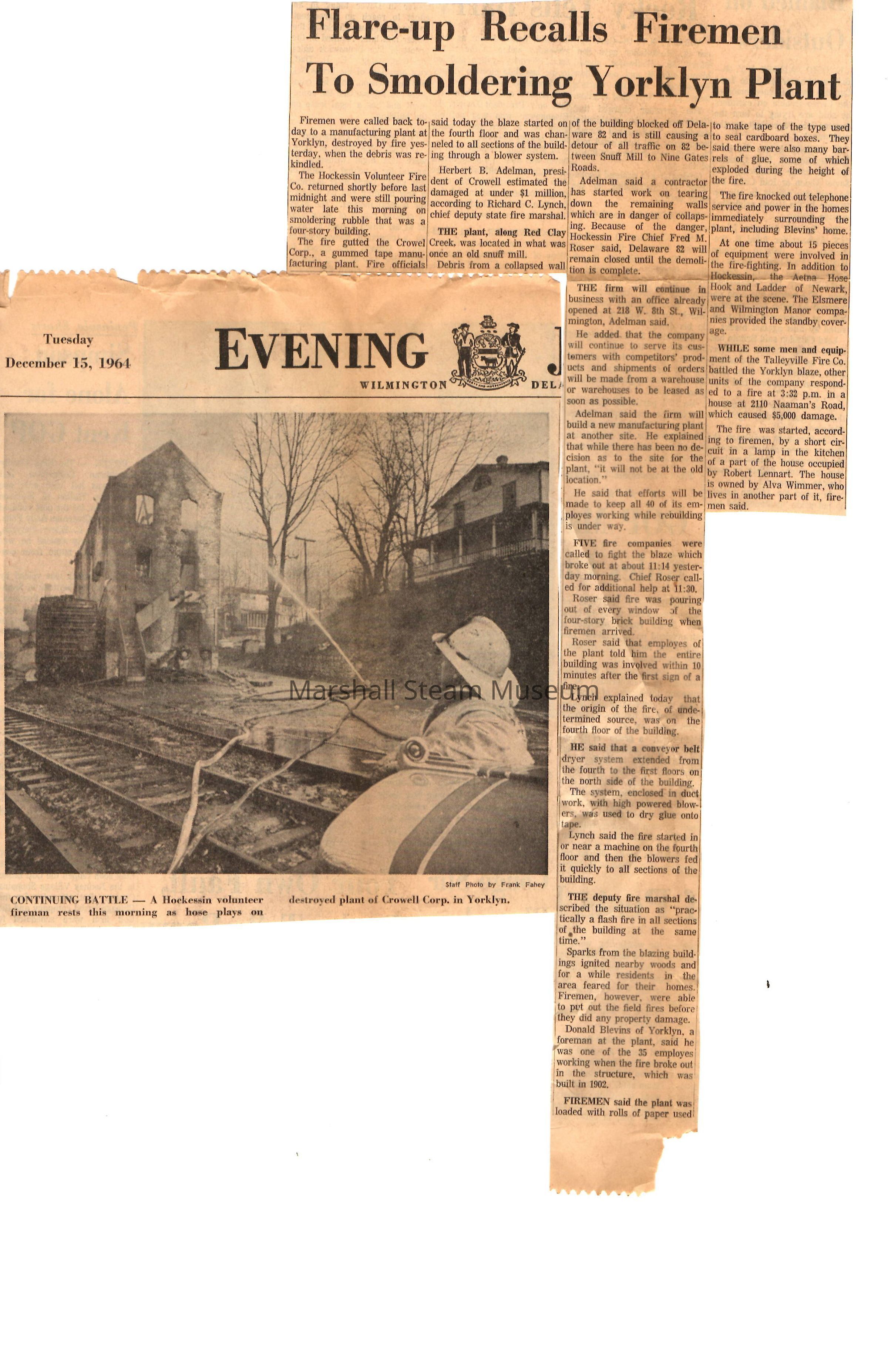 Wilmington Evening Journal article about the aftermath of the Crowell Tape Mill fire the day after, 1964Collection