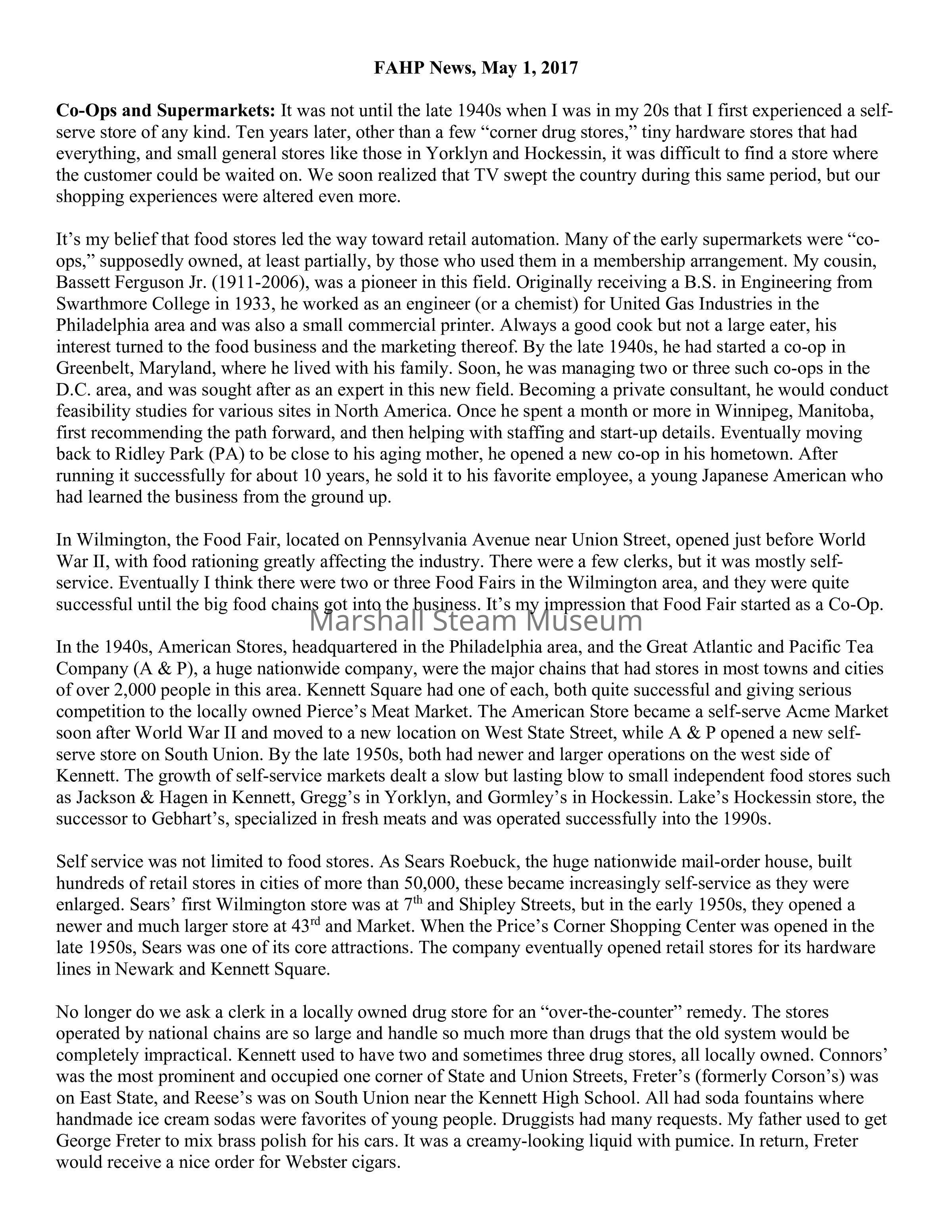 Co-Ops and Supermarkets: It was not until the late 1940s when I was in my 20s that I first experienced a self-serve store of any kind. Ten years later, other than a few “corner drug stores,” tiny hardware stores that had everything, and small general stores like those in Yorklyn and Hockessin, it was difficult to find a store where the customer could be waited on. We soon realized that TV swept the country during this same period, but our shopping experiences were altered even more.
