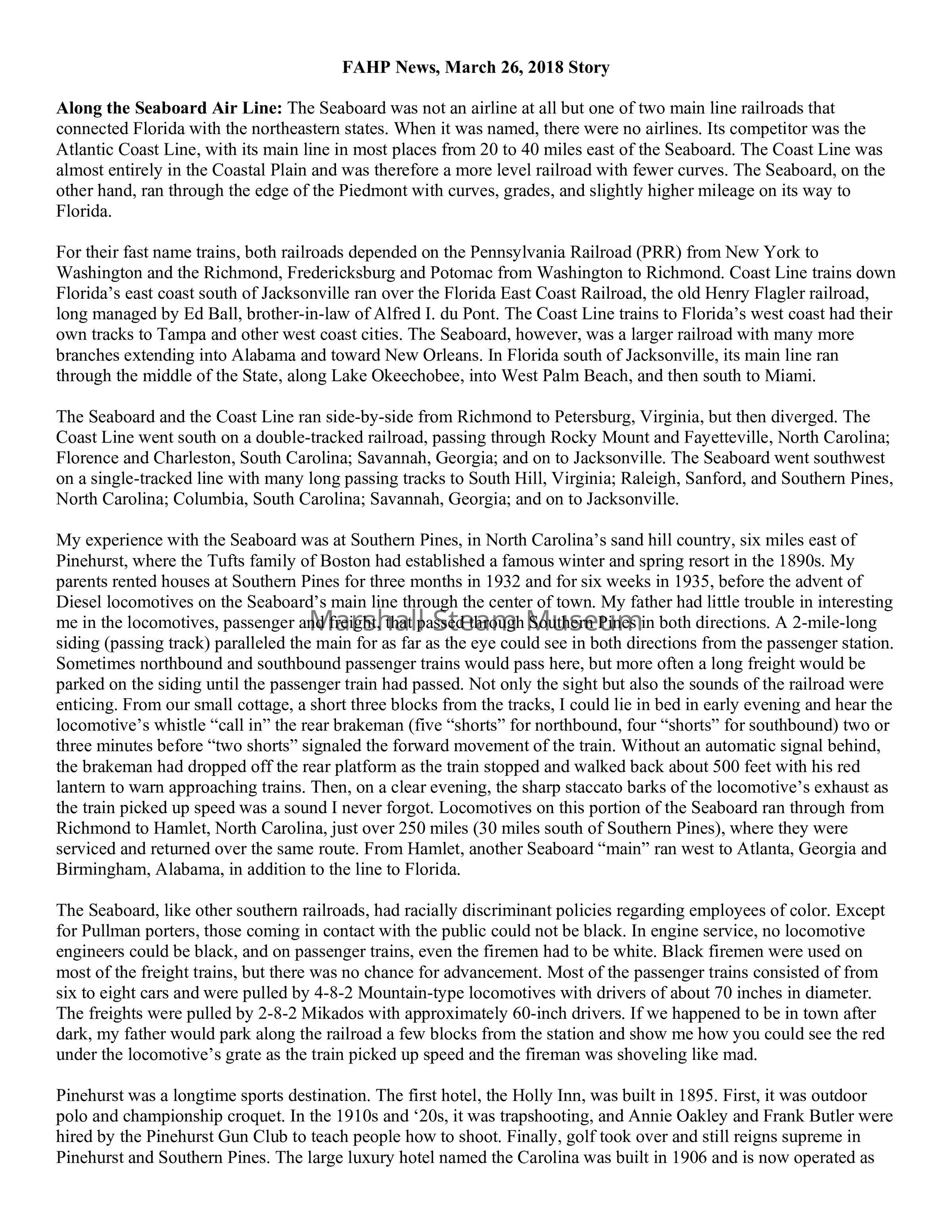 Along the Seaboard Air Line: The Seaboard was not an airline at all but one of two main line railroads that connected Florida with the northeastern states. When it was named, there were no airlines. Its competitor was the Atlantic Coast Line, with its main line in most places from 20 to 40 miles east of the Seaboard. The Coast Line was almost entirely in the Coastal Plain and was therefore a more level railroad with fewer curves. The Seaboard, on the other hand, ran through the edge of the Piedmont with curves, grades, and slightly higher mileage on its way to Florida.