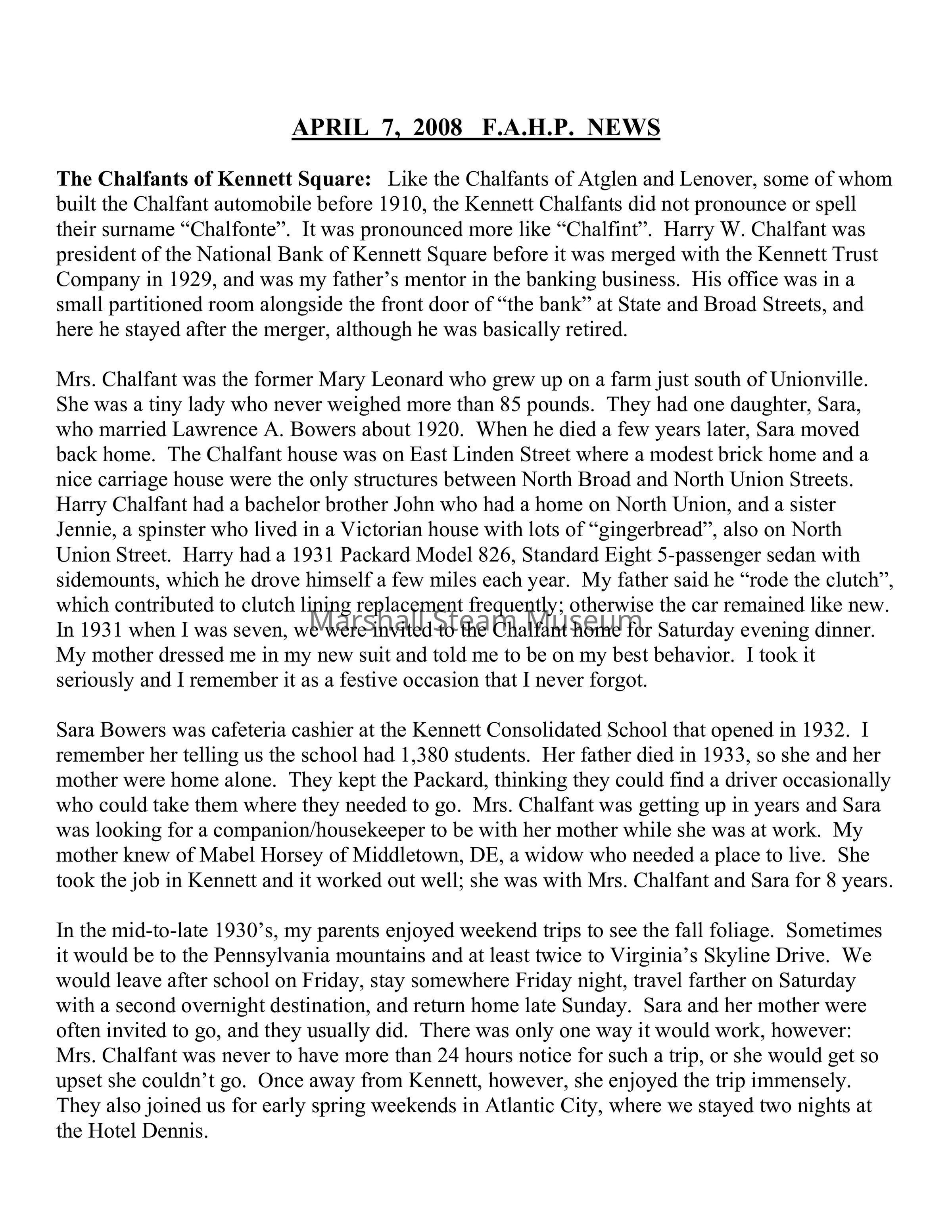 The Chalfants of Kennett Square: Like the Chalfants of Atglen and Lenover, some of whom built the Chalfant automobile before 1910, the Kennett Chalfants did not pronounce or spell their surname “Chalfonte”. It was pronounced more like “Chalfint”. Harry W. Chalfant was president of the National Bank of Kennett Square before it was merged with the Kennett Trust Company in 1929, and was my father’s mentor in the banking business. His office was in a small partitioned room alongside the front door of “the bank” at State and Broad Streets, and here he stayed after the merger, although he was basically retired.