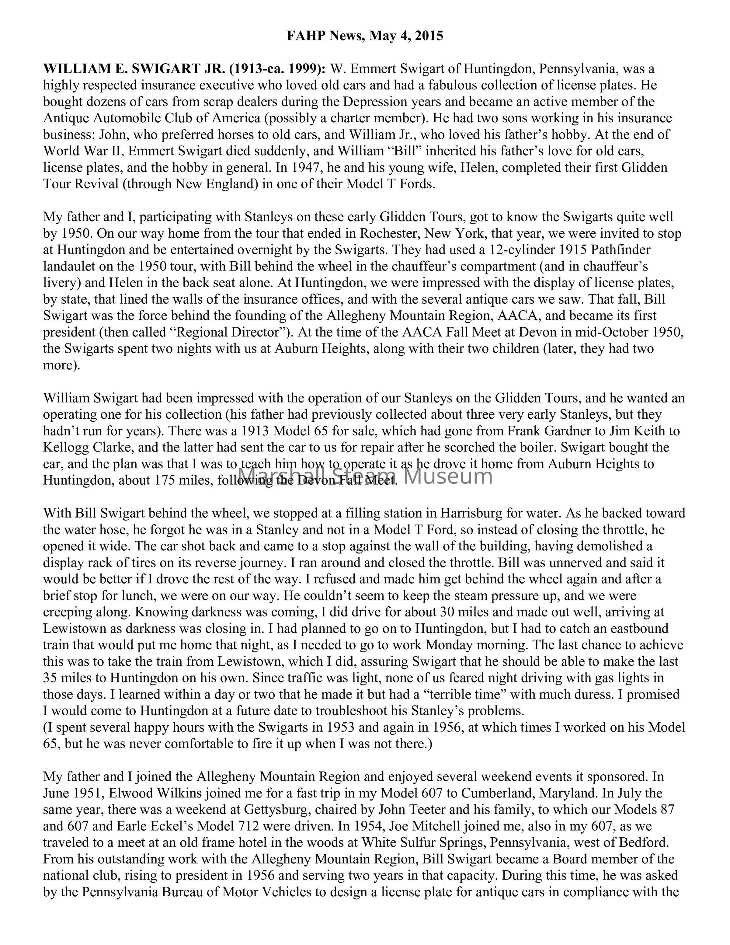 WILLIAM E. SWIGART JR. (1913-ca. 1999): W. Emmert Swigart of Huntingdon, Pennsylvania, was a highly respected insurance executive who loved old cars and had a fabulous collection of license plates. He bought dozens of cars from scrap dealers during the Depression years and became an active member of the Antique Automobile Club of America (possibly a charter member). He had two sons working in his insurance business: John, who preferred horses to old cars, and William Jr., who loved his father’s hobby. At the end of World War II, Emmert Swigart died suddenly, and William “Bill” inherited his father’s love for old cars, license plates, and the hobby in general. In 1947, he and his young wife, Helen, completed their first Glidden Tour Revival (through New England) in one of their Model T Fords.