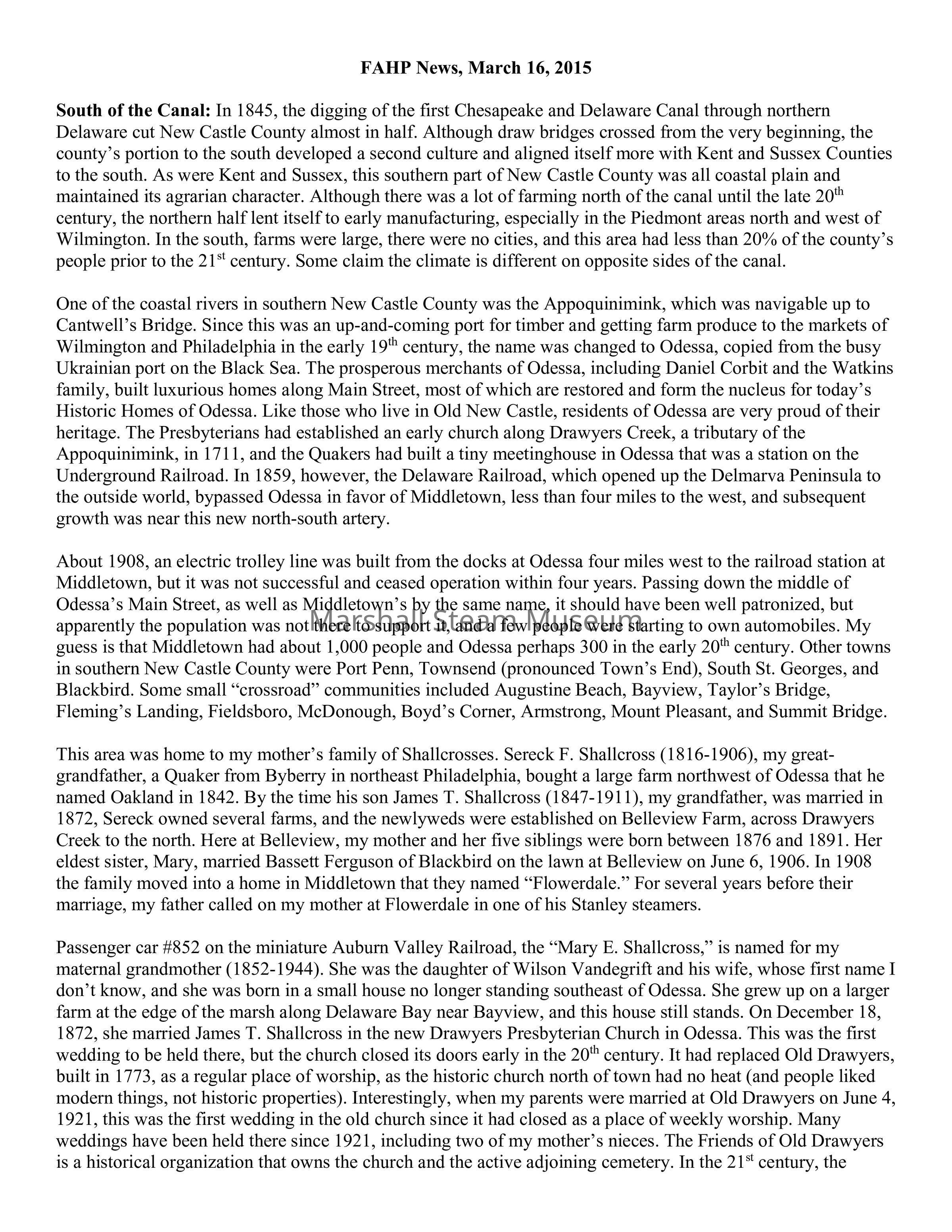Passenger car #852 on the miniature Auburn Valley Railroad, the “Mary E. Shallcross,” is named for my maternal grandmother (1852-1944). She was the daughter of Wilson Vandegrift and his wife, whose first name I don’t know, and she was born in a small house no longer standing southeast of Odessa. She grew up on a larger farm at the edge of the marsh along Delaware Bay near Bayview, and this house still stands. On December 18, 1872, she married James T. Shallcross in the new Drawyers Presbyterian Church in Odessa. This was the first wedding to be held there, but the church closed its doors early in the 20th century. It had replaced Old Drawyers, built in 1773, as a regular place of worship, as the historic church north of town had no heat (and people liked modern things, not historic properties). Interestingly, when my parents were married at Old Drawyers on June 4, 1921, this was the first wedding in the old church since it had closed as a place of weekly worship. Many weddings have been held there since 1921, including two of my mother’s nieces. The Friends of Old Drawyers is a historical organization that owns the church and the active adjoining cemetery. In the 21st century, the population of New Castle County south of the canal is growing “by leaps and bounds.” In 2013, Middletown’s population was estimated at 20,000.