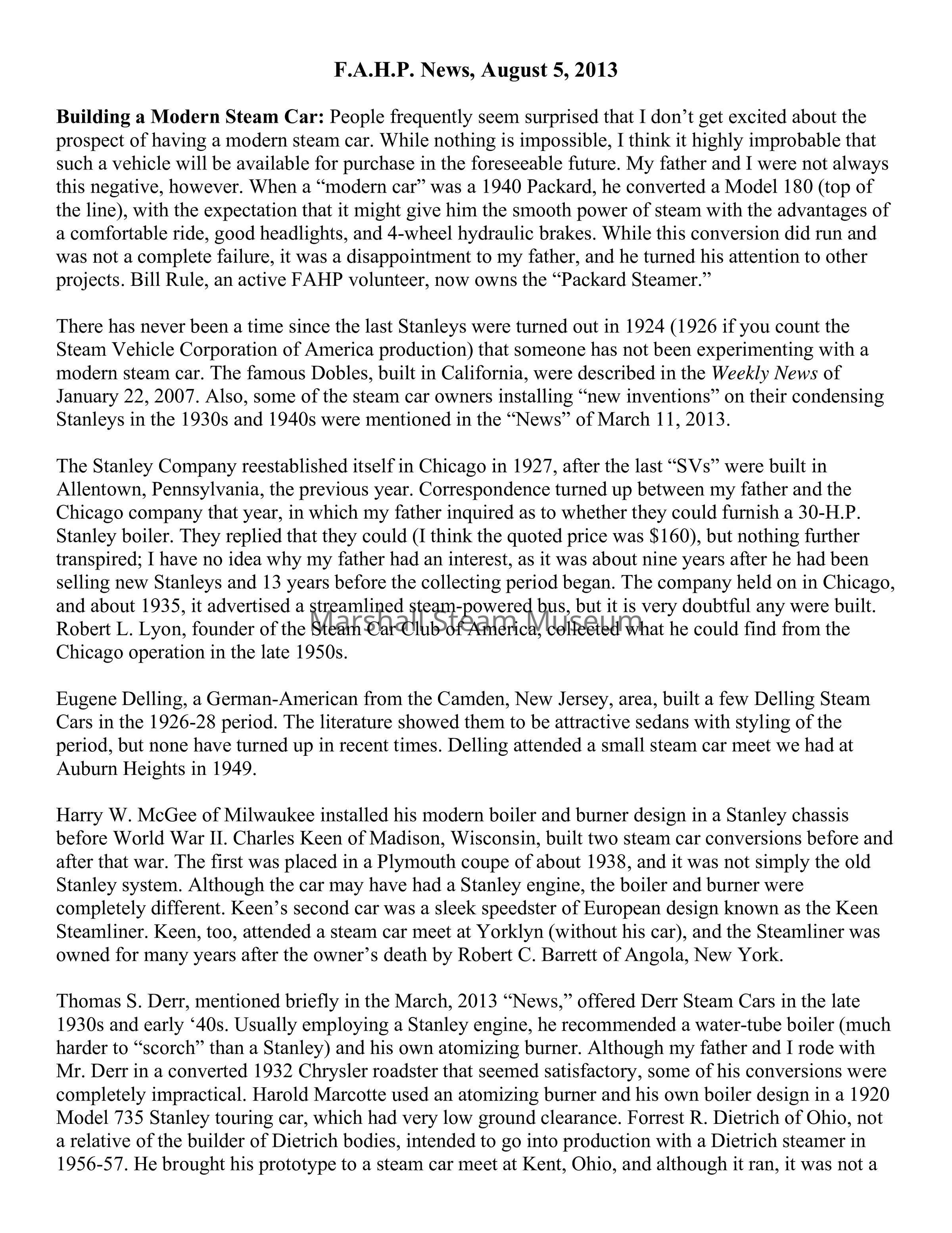 Building a Modern Steam Car: People frequently seem surprised that I don’t get excited about the prospect of having a modern steam car. While nothing is impossible, I think it highly improbable that such a vehicle will be available for purchase in the foreseeable future. My father and I were not always this negative, however. When a “modern car” was a 1940 Packard, he converted a Model 180 (top of the line), with the expectation that it might give him the smooth power of steam with the advantages of a comfortable ride, good headlights, and 4-wheel hydraulic brakes. While this conversion did run and was not a complete failure, it was a disappointment to my father, and he turned his attention to other projects. Bill Rule, an active FAHP volunteer, now owns the “Packard Steamer.”