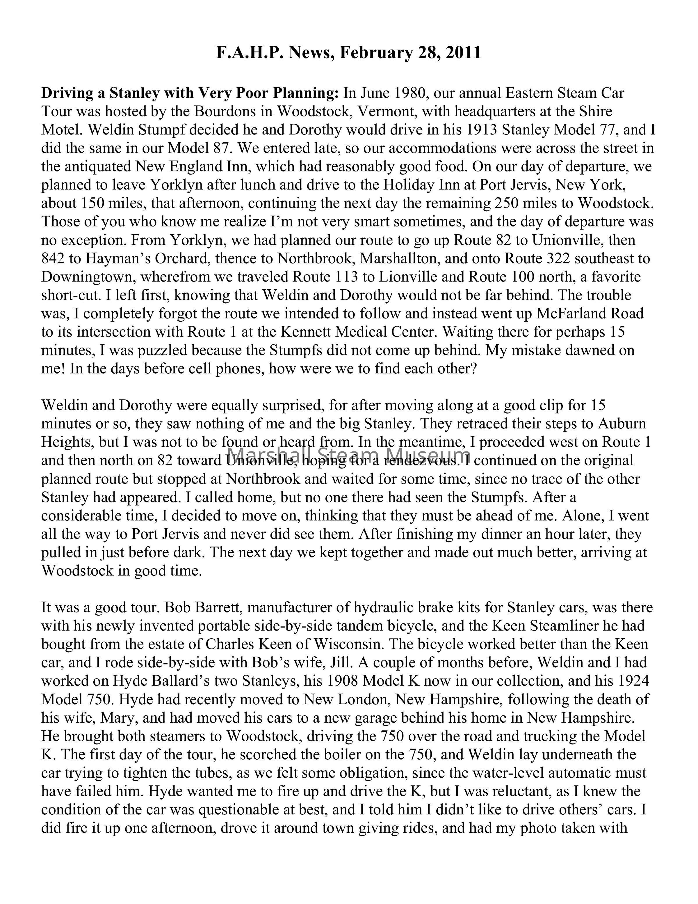 Driving a Stanley with Very Poor Planning: In June 1980, our annual Eastern Steam Car Tour was hosted by the Bourdons in Woodstock, Vermont, with headquarters at the Shire Motel. Weldin Stumpf decided he and Dorothy would drive in his 1913 Stanley Model 77, and I did the same in our Model 87. We entered late, so our accommodations were across the street in the antiquated New England Inn, which had reasonably good food. On our day of departure, we planned to leave Yorklyn after lunch and drive to the Holiday Inn at Port Jervis, New York, about 150 miles, that afternoon, continuing the next day the remaining 250 miles to Woodstock.