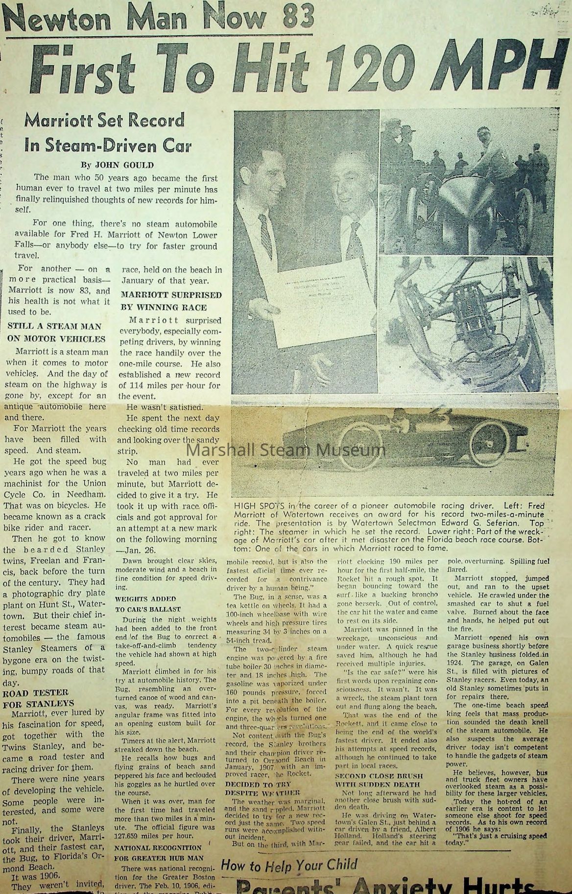 Original article from the "Boston Traveler" interviewing Fred Marriott about his 1906 land speed record in the Stanley Racer in Ormond Beach, FL, in 1906.