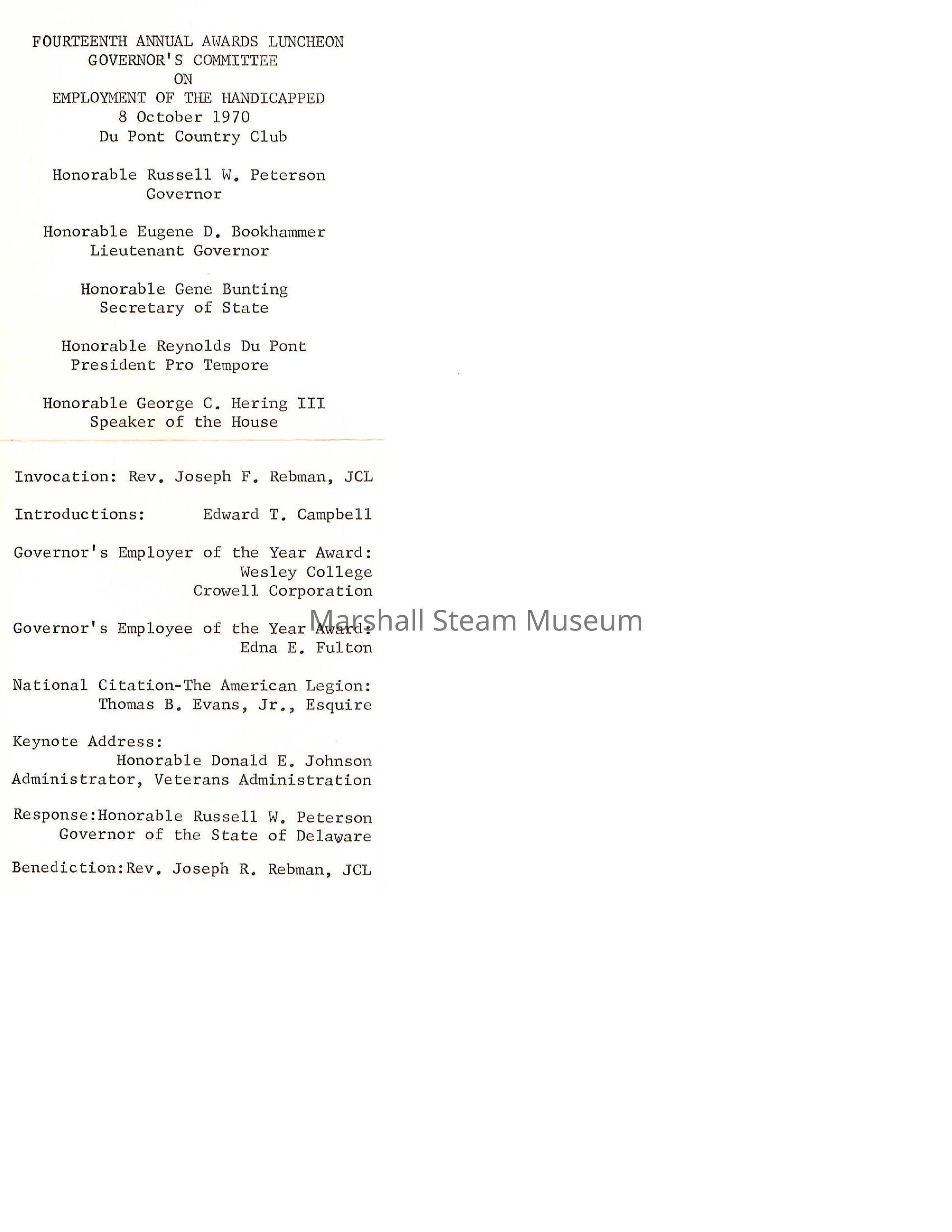Agenda from the Governor's Committee on Employment Award luncheon at the DuPont Country Club, October 1970Collection
