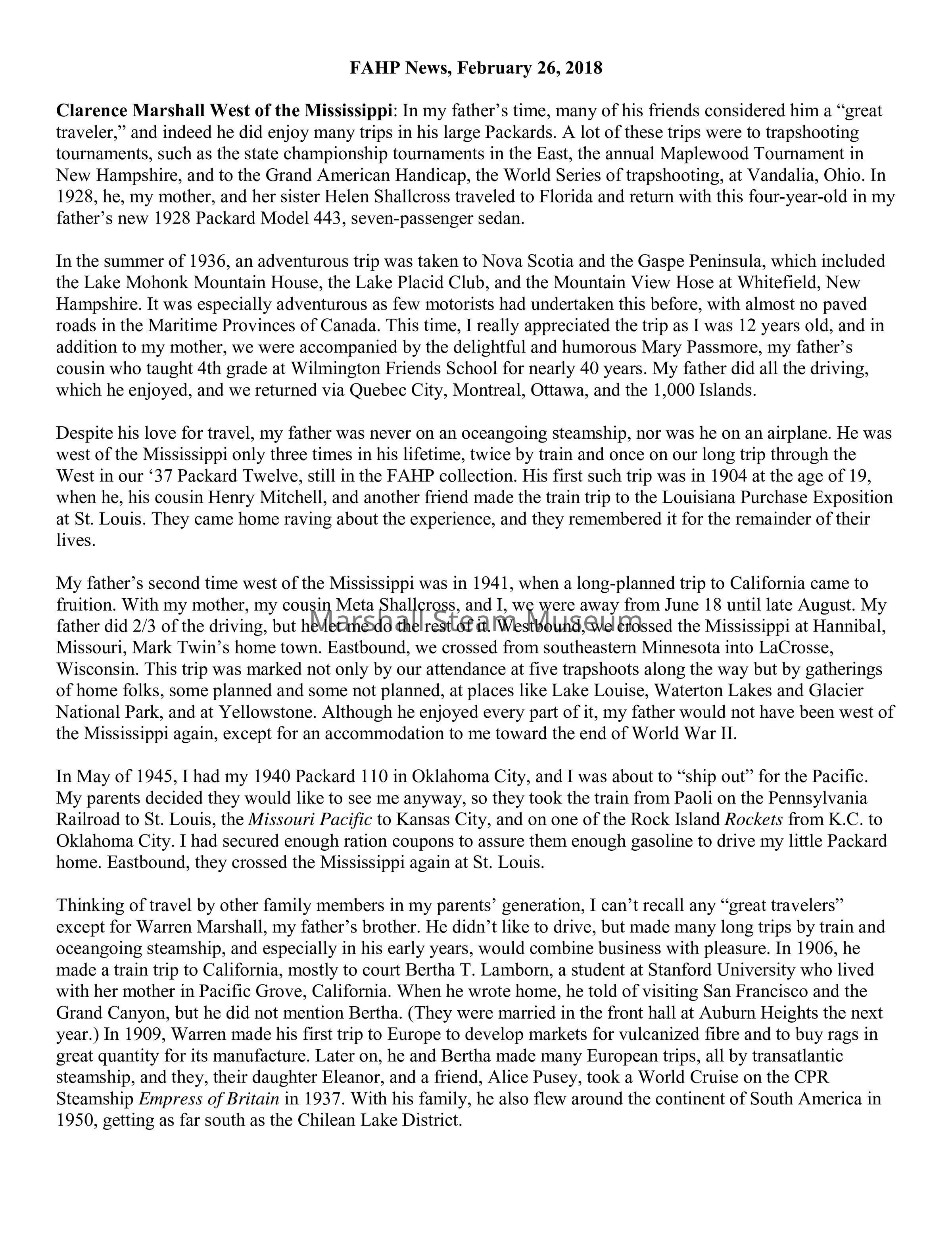 Clarence Marshall West of the Mississippi: In my father’s time, many of his friends considered him a “great traveler,” and indeed he did enjoy many trips in his large Packards. A lot of these trips were to trapshooting tournaments, such as the state championship tournaments in the East, the annual Maplewood Tournament in New Hampshire, and to the Grand American Handicap, the World Series of trapshooting, at Vandalia, Ohio. In 1928, he, my mother, and her sister Helen Shallcross traveled to Florida and return with this four-year-old in my father’s new 1928 Packard Model 443, seven-passenger sedan.