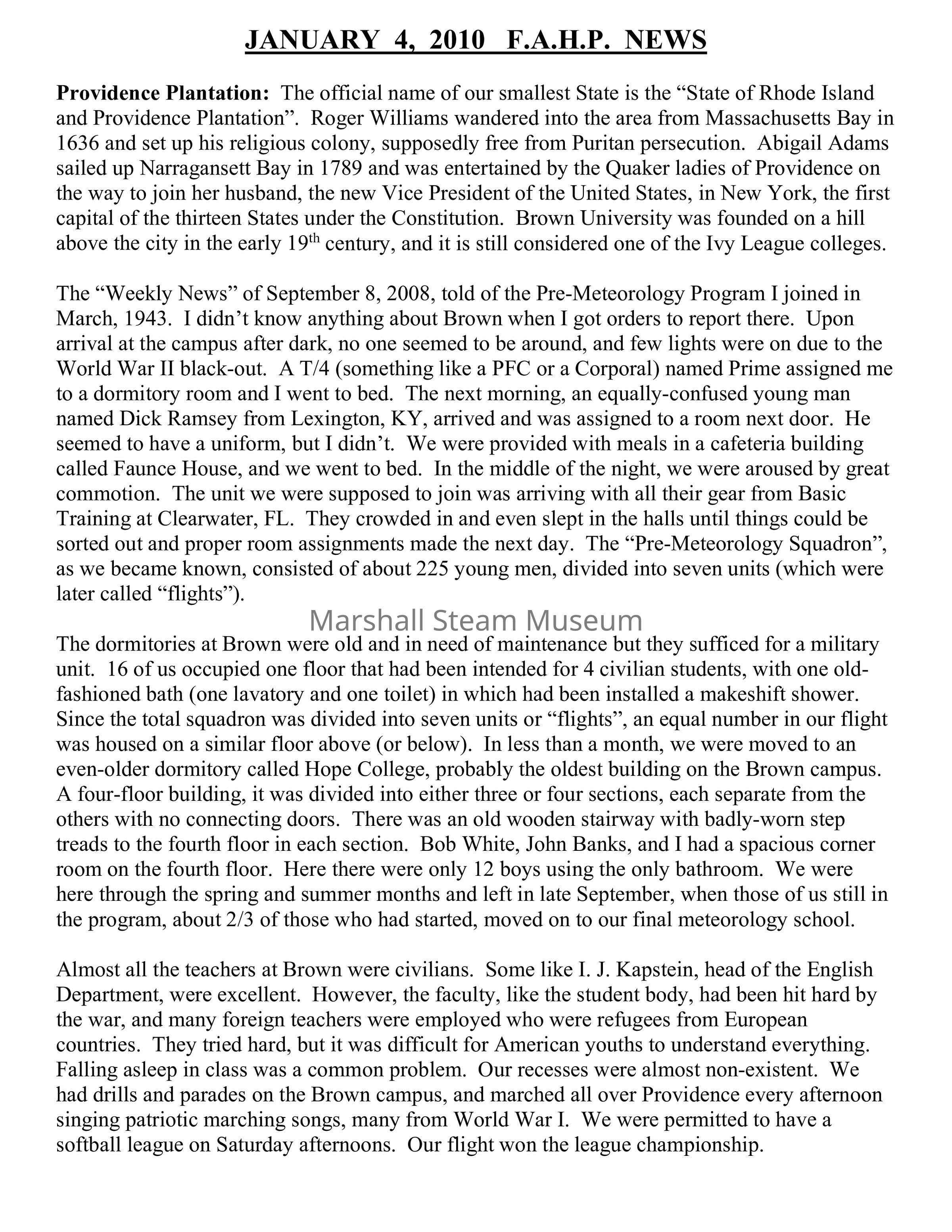 The “Weekly News” of September 8, 2008, told of the Pre-Meteorology Program I joined in March, 1943. I didn’t know anything about Brown when I got orders to report there. Upon arrival at the campus after dark, no one seemed to be around, and few lights were on due to the World War II black-out. A T/4 (something like a PFC or a Corporal) named Prime assigned me to a dormitory room and I went to bed. The next morning, an equally-confused young man named Dick Ramsey from Lexington, KY, arrived and was assigned to a room next door. He seemed to have a uniform, but I didn’t. We were provided with meals in a cafeteria building called Faunce House, and we went to bed. In the middle of the night, we were aroused by great commotion. The unit we were supposed to join was arriving with all their gear from Basic Training at Clearwater, FL. They crowded in and even slept in the halls until things could be sorted out and proper room assignments made the next day. The “Pre-Meteorology Squadron”, as we became known, consisted of about 225 young men, divided into seven units (which were later called “flights”).