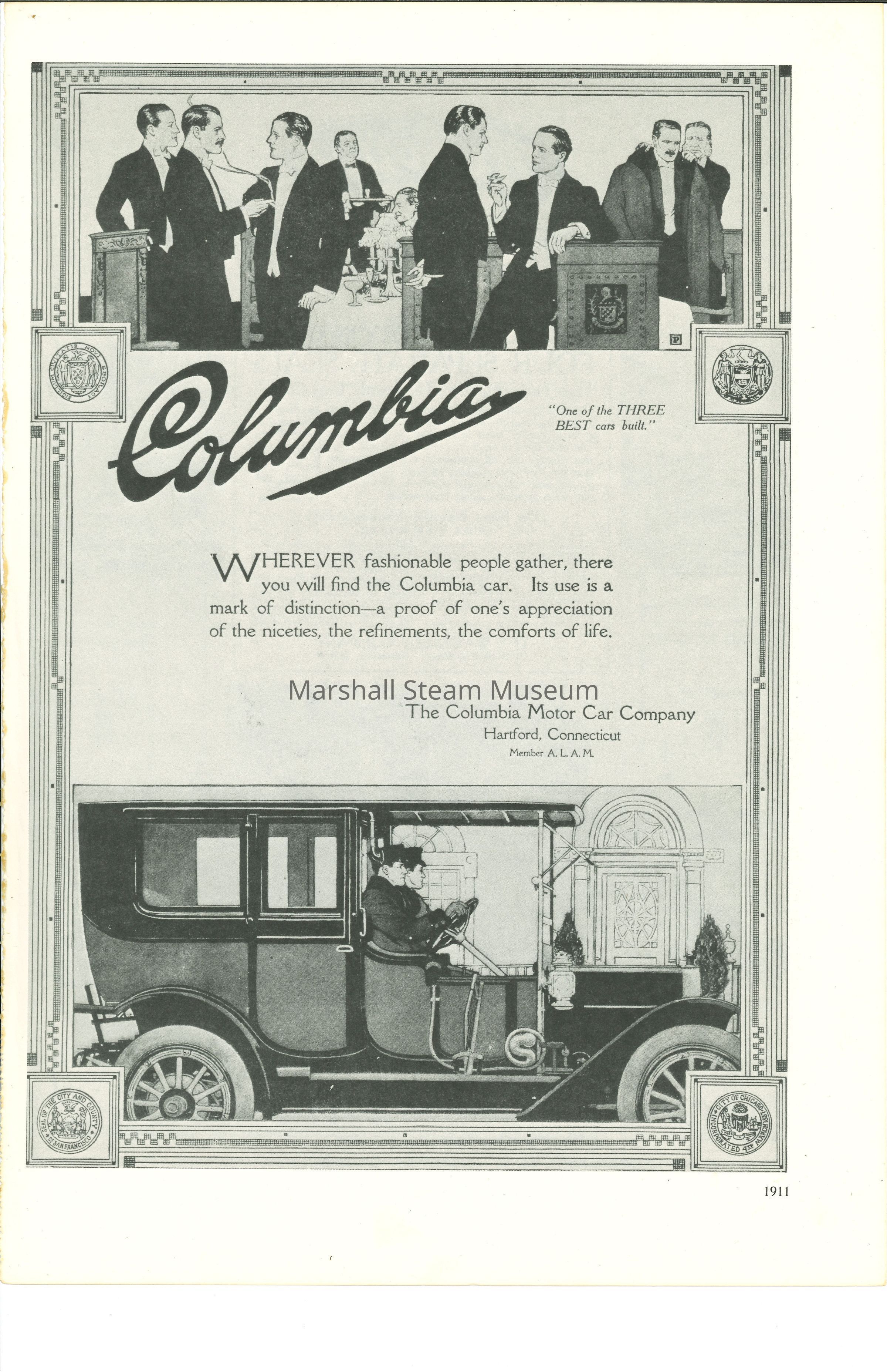 1911 advertisement for Columbia Motor scanned excerpt from "The Poster Book of Antique Auto Ads" by Howard Garrett
