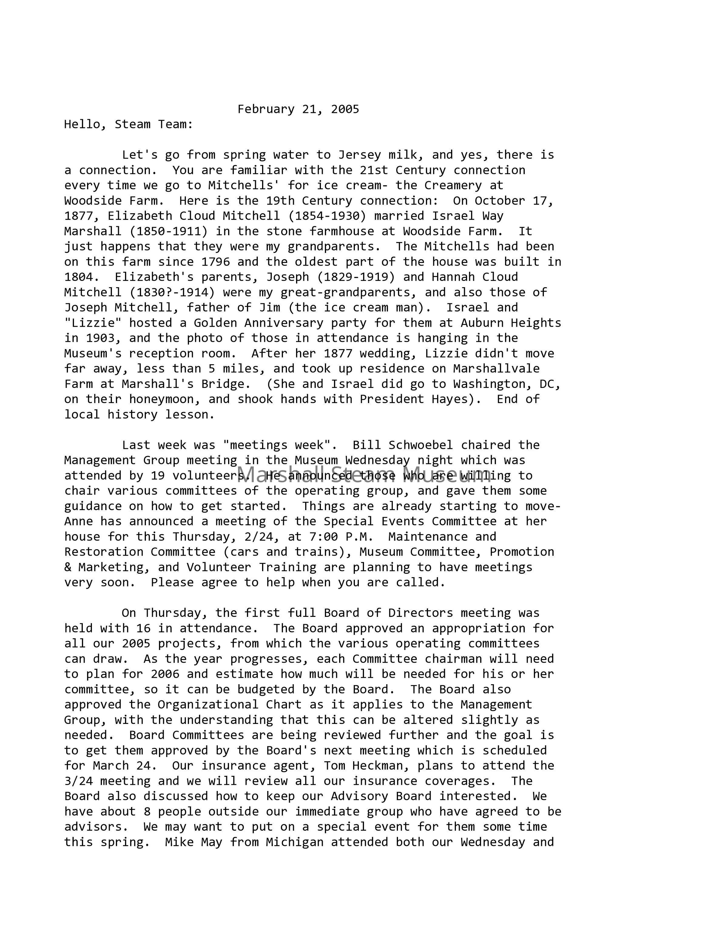 On Thursday, the first full Board of Directors meeting was held with 16 in attendance. The Board approved an appropriation for all our 2005 projects, from which the various operating committees can draw. As the year progresses, each Committee chairman will need to plan for 2006 and estimate how much will be needed for his or her committee, so it can be budgeted by the Board. The Board also approved the Organizational Chart as it applies to the Management Group, with the understanding that this can be altered slightly as needed. Board Committees are being reviewed further and the goal is to get them approved by the Board's next meeting which is scheduled for March 24. Our insurance agent, Tom Heckman, plans to attend the 3/24 meeting and we will review all our insurance coverages. The Board also discussed how to keep our Advisory Board interested. We have about 8 people outside our immediate group who have agreed to be advisors. We may want to put on a special event for them some time this spring. Mike May from Michigan attended both our Wednesday and Thursday meetings, and we were glad to have our distant friend, steam car expert, and Board member with us.
