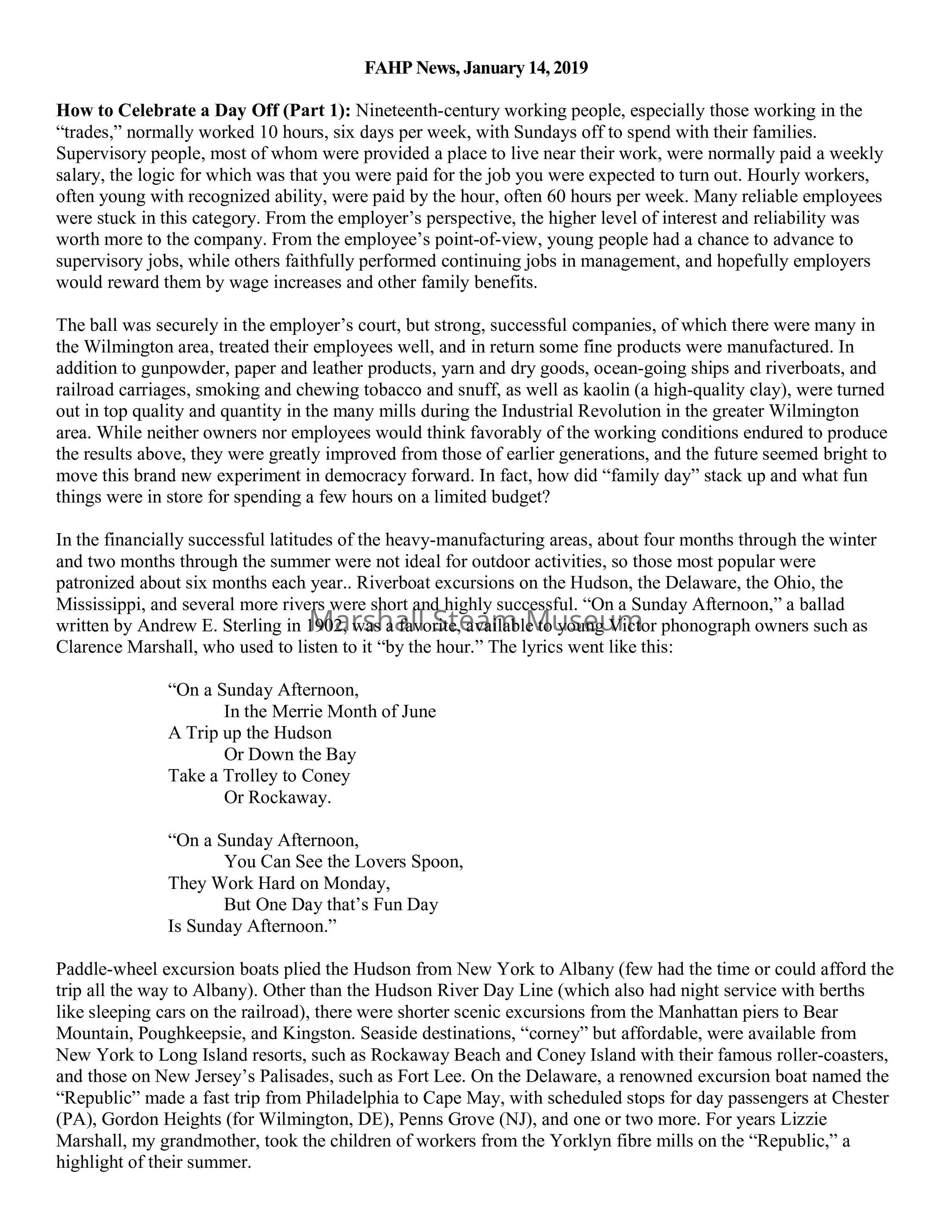 In the financially successful latitudes of the heavy-manufacturing areas, about four months through the winter and two months through the summer were not ideal for outdoor activities, so those most popular were patronized about six months each year.. Riverboat excursions on the Hudson, the Delaware, the Ohio, the Mississippi, and several more rivers were short and highly successful. “On a Sunday Afternoon,” a ballad written by Andrew E. Sterling in 1902, was a favorite, available to young Victor phonograph owners such as Clarence Marshall, who used to listen to it “by the hour.” The lyrics went like this: