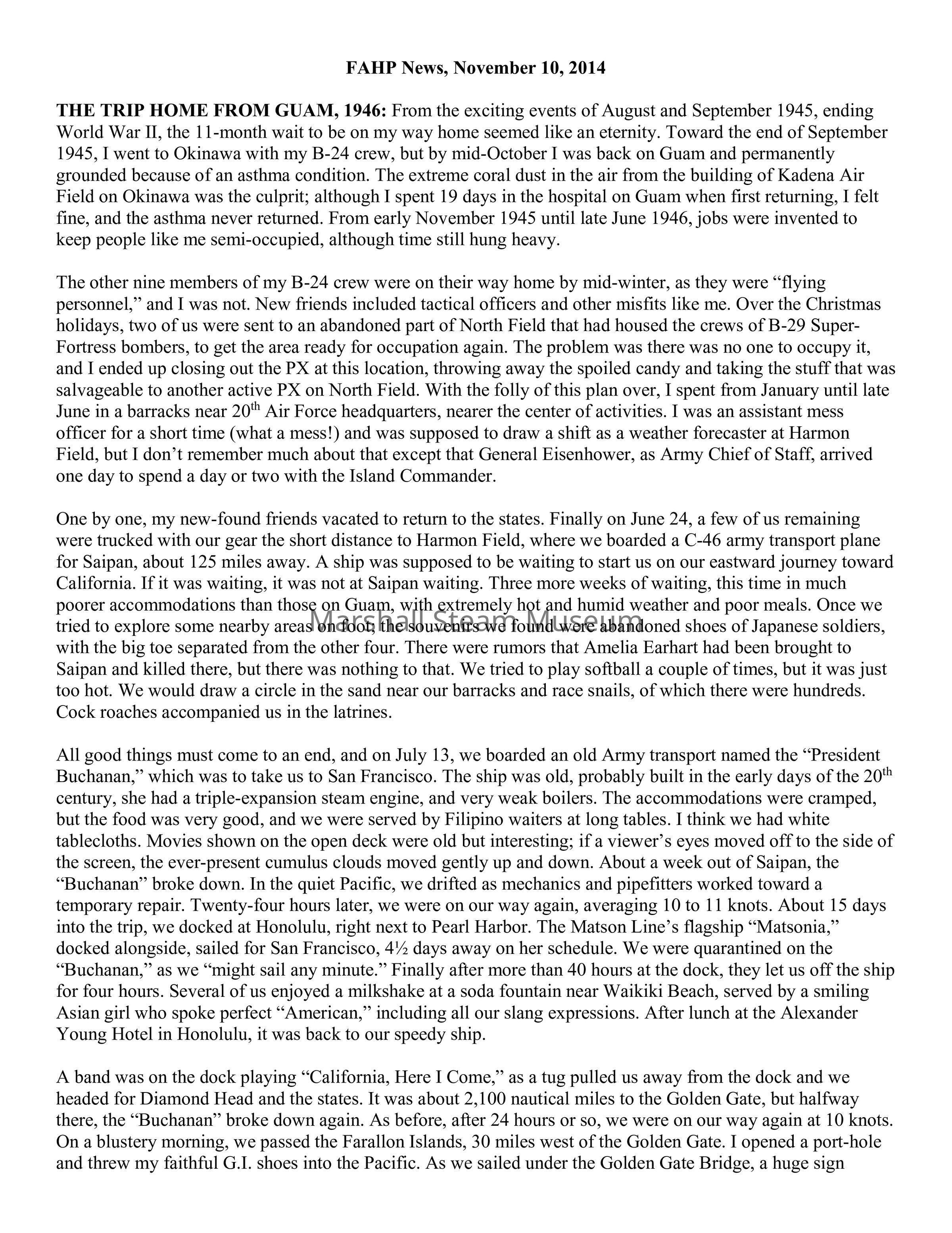 THE TRIP HOME FROM GUAM, 1946: From the exciting events of August and September 1945, ending World War II, the 11-month wait to be on my way home seemed like an eternity. Toward the end of September 1945, I went to Okinawa with my B-24 crew, but by mid-October I was back on Guam and permanently grounded because of an asthma condition. The extreme coral dust in the air from the building of Kadena Air Field on Okinawa was the culprit; although I spent 19 days in the hospital on Guam when first returning, I felt fine, and the asthma never returned. From early November 1945 until late June 1946, jobs were invented to keep people like me semi-occupied, although time still hung heavy.