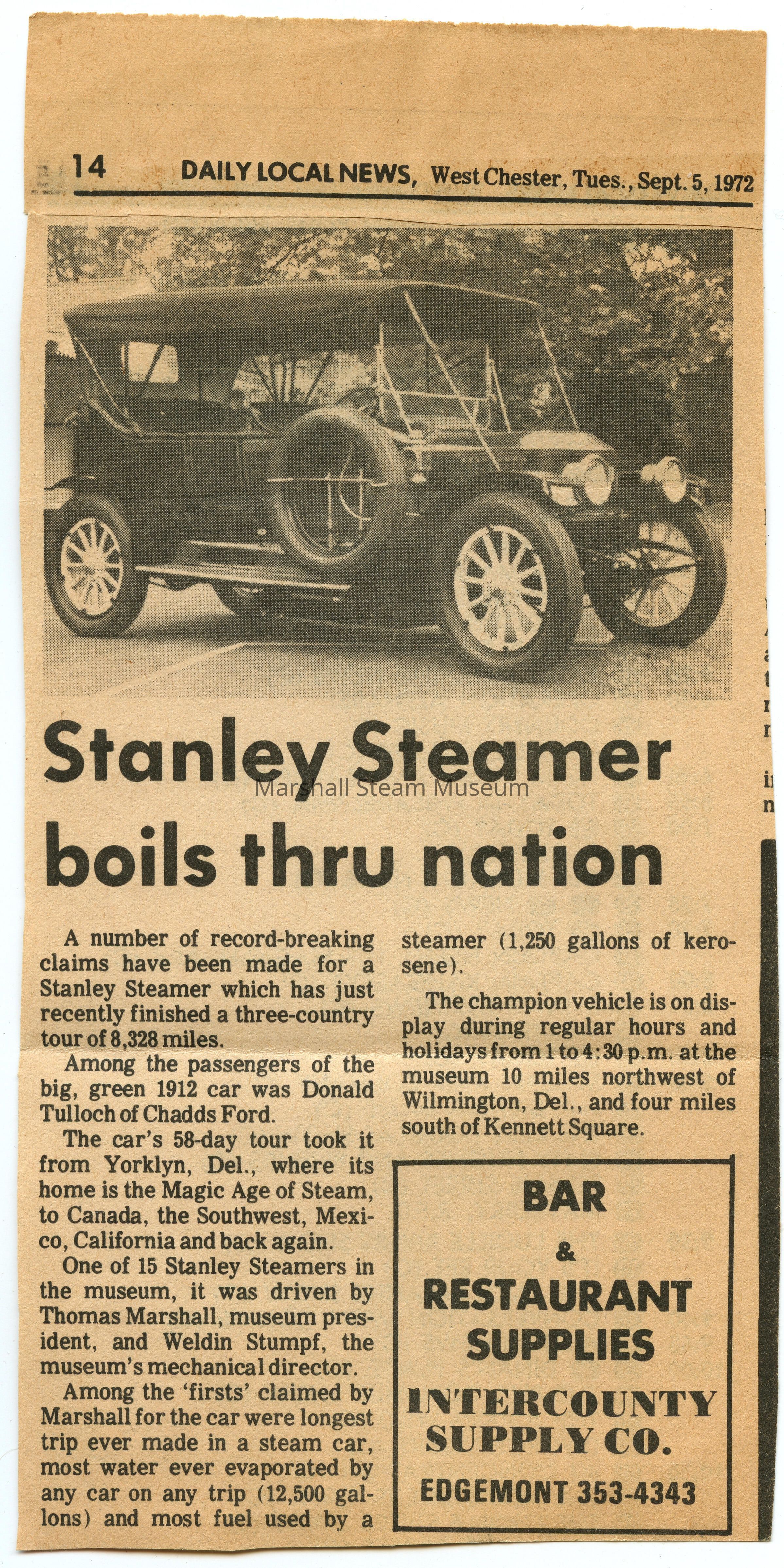 Newspaper clipping from Daily Local News in West Chester, Tuesday Sept. 6, 1972 describing Tom Marshall's record breaking tour in his 1912 Stanley Steamer