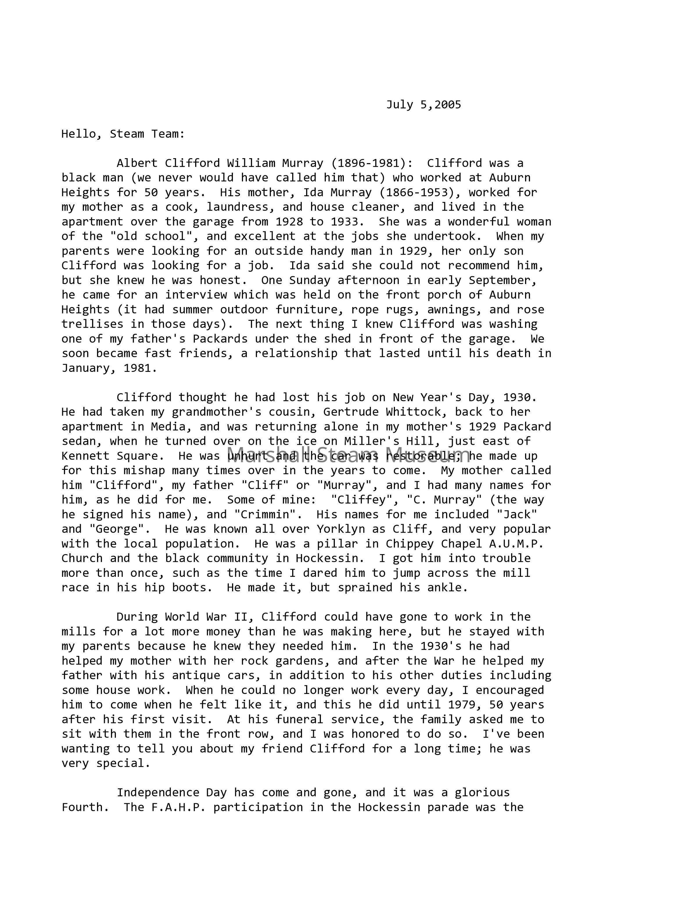 Clifford thought he had lost his job on New Year's Day, 1930. He had taken my grandmother's cousin, Gertrude Whittock, back to her apartment in Media, and was returning alone in my mother's 1929 Packard sedan, when he turned over on the ice on Miller's Hill, just east of Kennett Square. He was unhurt and the car was restorable; he made up for this mishap many times over in the years to come. My mother called him "Clifford", my father "Cliff" or "Murray", and I had many names for him, as he did for me. Some of mine: "Cliffey", "C. Murray" (the way he signed his name), and "Crimmin". His names for me included "Jack" and "George". He was known all over Yorklyn as Cliff, and very popular with the local population. He was a pillar in Chippey Chapel A.U.M.P. Church and the black community in Hockessin. I got him into trouble more than once, such as the time I dared him to jump across the mill race in his hip boots. He made it, but sprained his ankle.