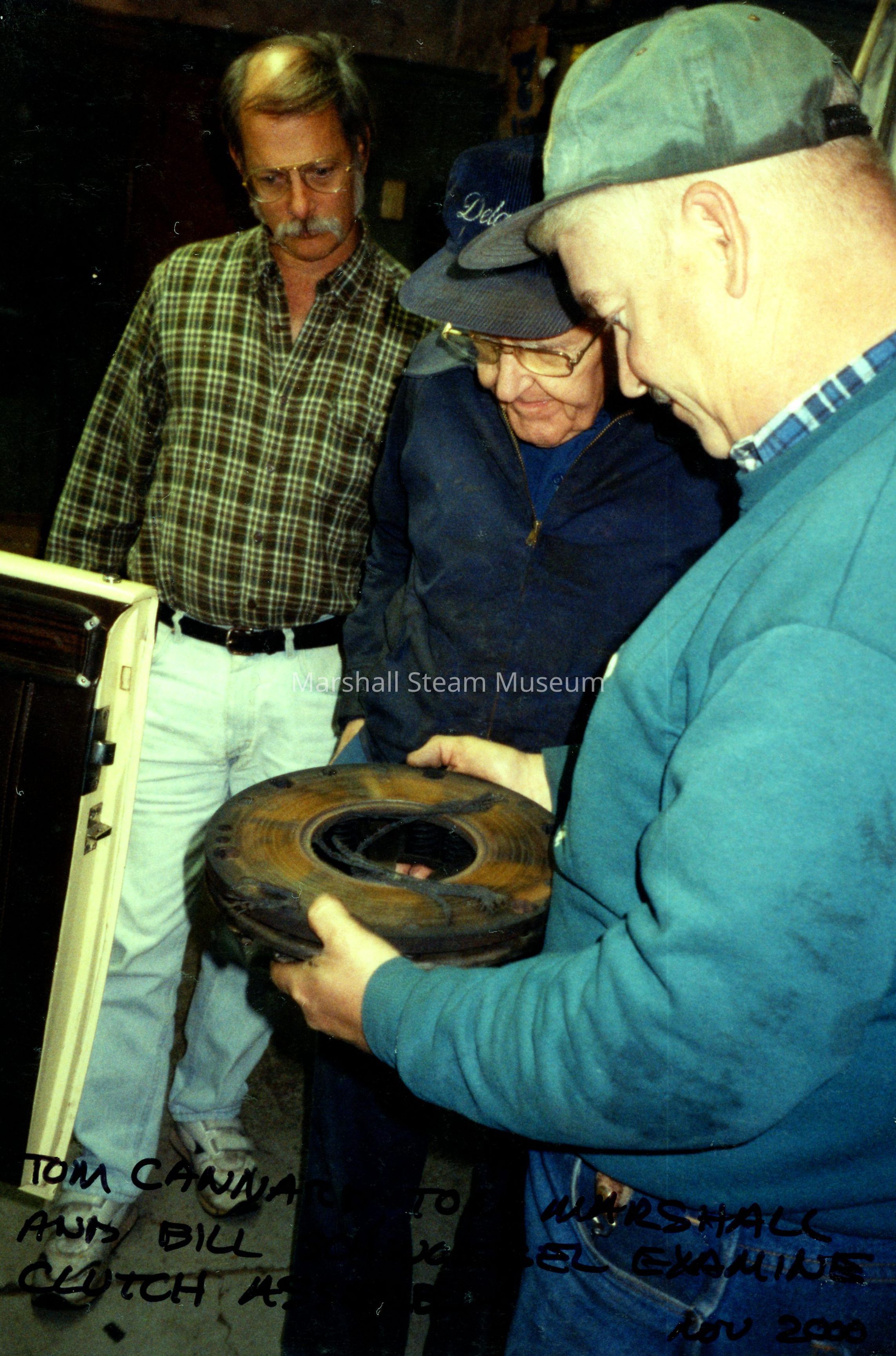 Tom Cannard, Tom Marshall and Bill Schwoebel examine a clutch assembly at a Steam Team work sessionPhotograph Details