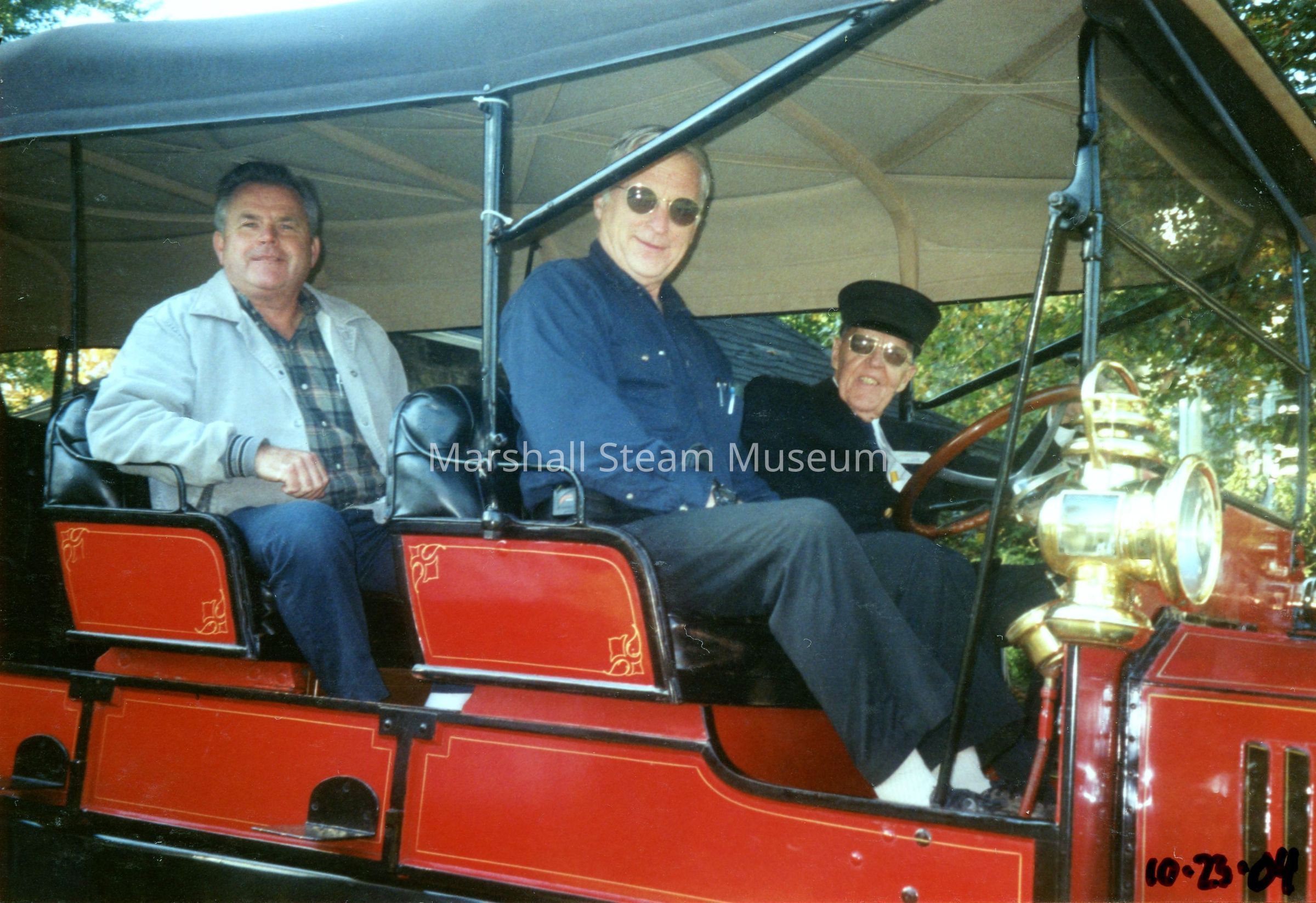 Tom Marshall driving Tom Angel (l) and Ernie Ross (r) in the 1915 Stanley Mountain Wagon at the October eventPhotograph Details