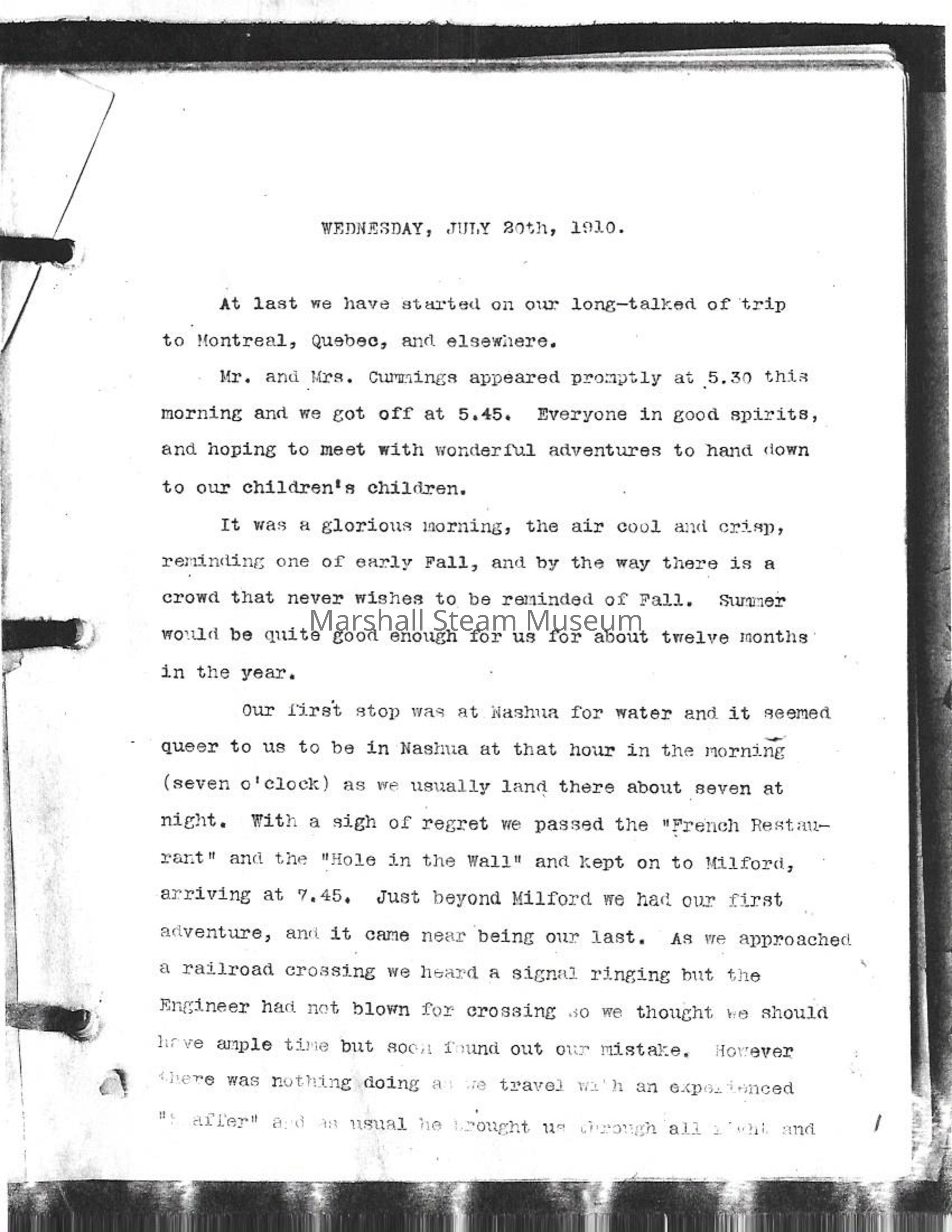 1910 travel log of Mr. and Mrs. Edwin Cummings in a Stanley steam car through New England and Canada. The photocopy was sent to Art Hart from Bill Cummings in 1994.