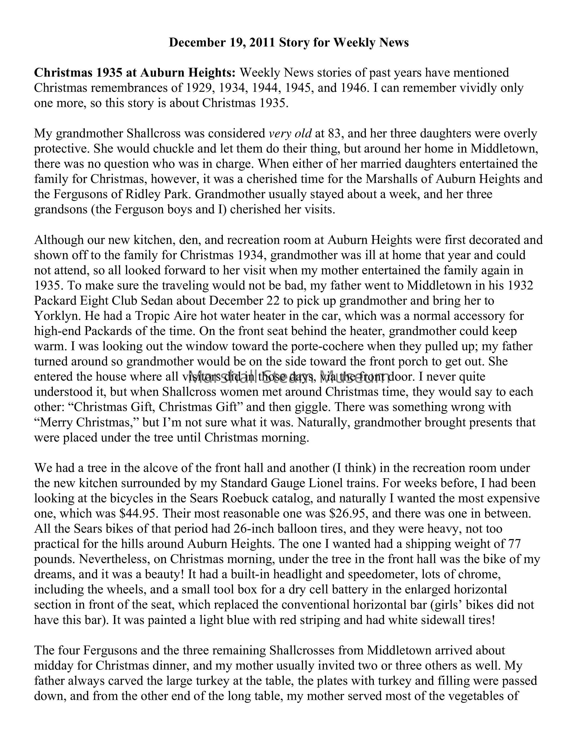 Christmas 1935 at Auburn Heights: Weekly News stories of past years have mentioned Christmas remembrances of 1929, 1934, 1944, 1945, and 1946. I can remember vividly only one more, so this story is about Christmas 1935.