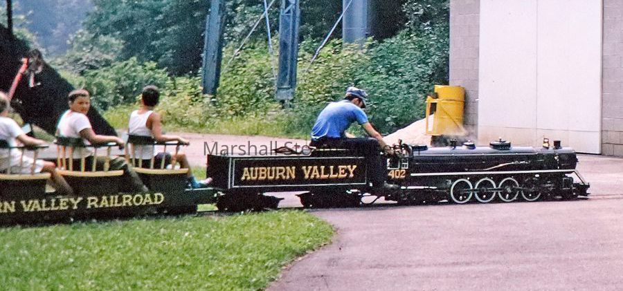 Engine 402 being operated by Larry Jensen at the back crossing at Magic Age of Steam, 1973Photograph Details