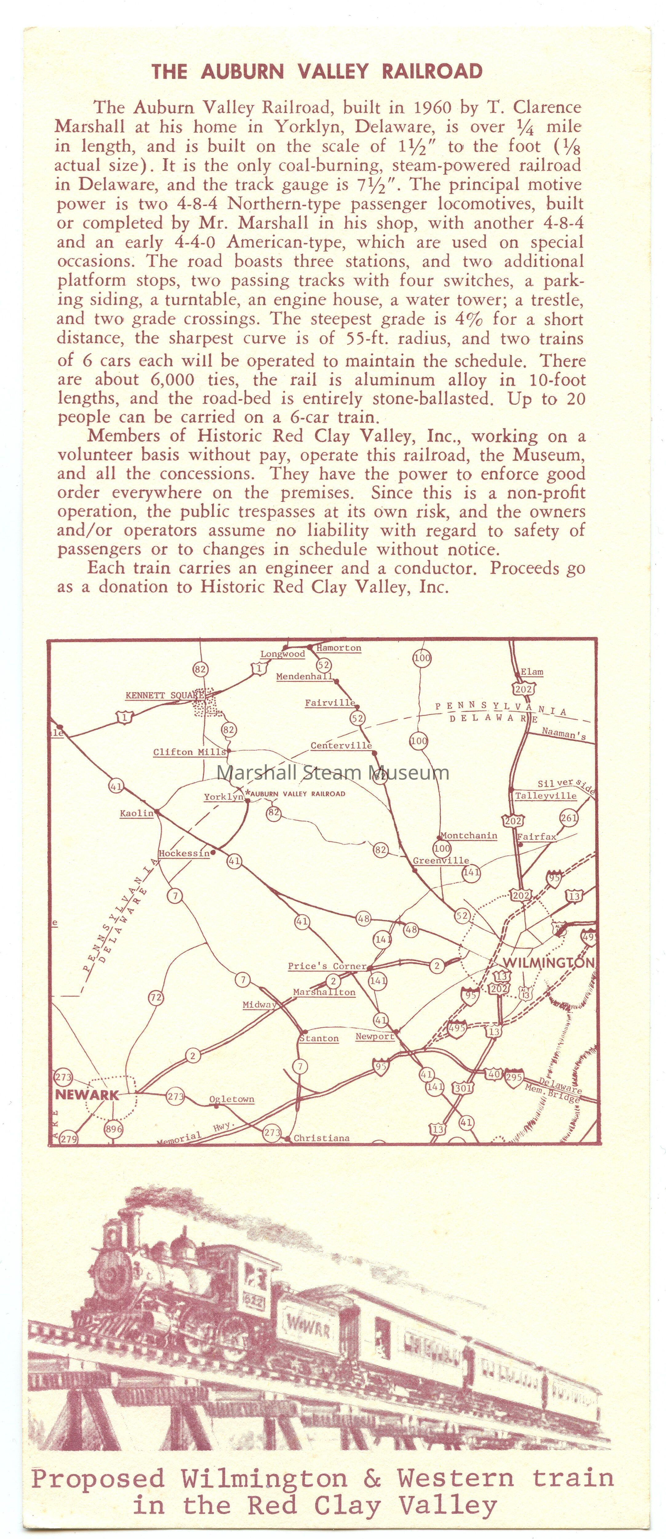 Back of brochure gives brief history and overview of Auburn Valley Railroad and T. Clarence MarshallMade/Created