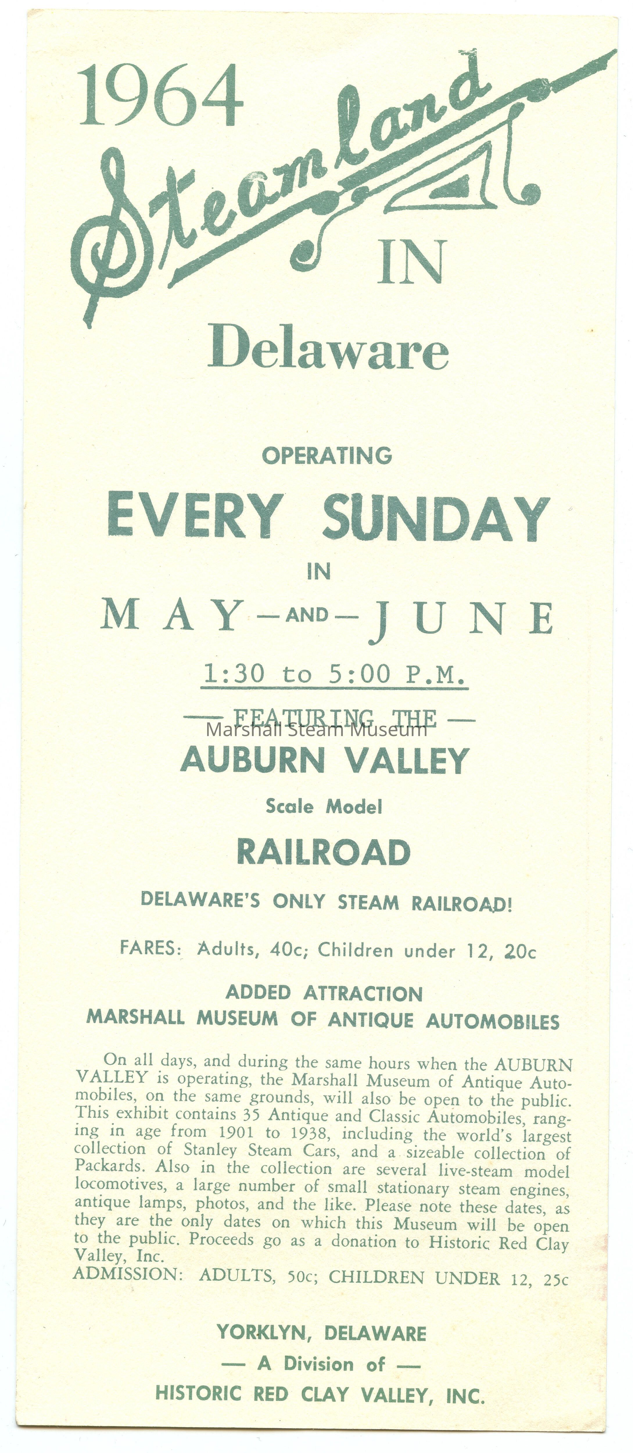 An advertisement of 1964 Steamland in Delaware operating every Sunday in May and June featuring the Auburn Valley scale model Railroad and the Marshall Museum of Antique Automobiles in Yorklyn, Delaware.