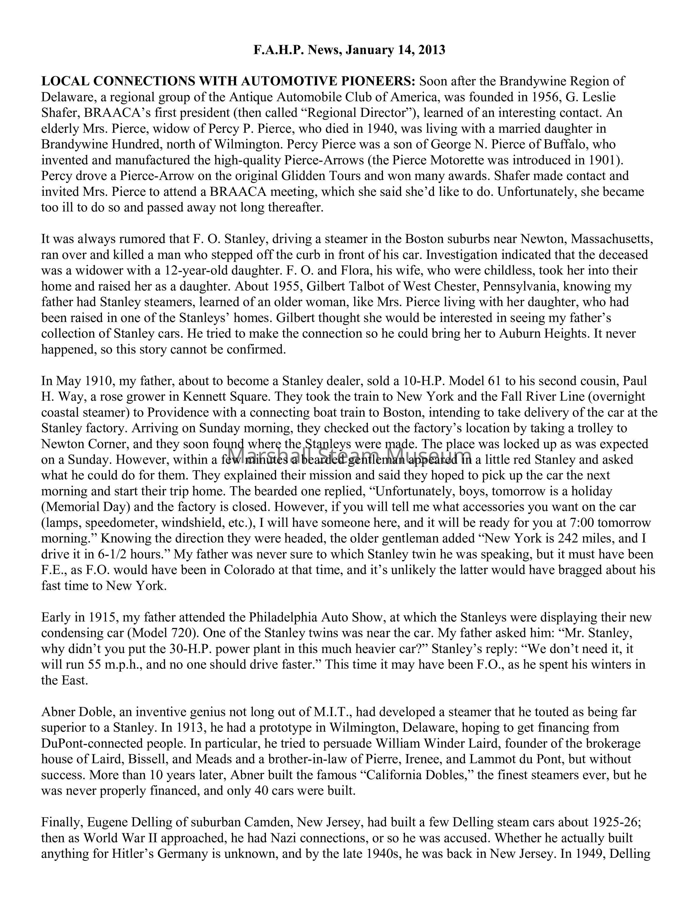 It was always rumored that F. O. Stanley, driving a steamer in the Boston suburbs near Newton, Massachusetts, ran over and killed a man who stepped off the curb in front of his car. Investigation indicated that the deceased was a widower with a 12-year-old daughter. F. O. and Flora, his wife, who were childless, took her into their home and raised her as a daughter. About 1955, Gilbert Talbot of West Chester, Pennsylvania, knowing my father had Stanley steamers, learned of an older woman, like Mrs. Pierce living with her daughter, who had been raised in one of the Stanleys’ homes. Gilbert thought she would be interested in seeing my father’s collection of Stanley cars. He tried to make the connection so he could bring her to Auburn Heights. It never happened, so this story cannot be confirmed.