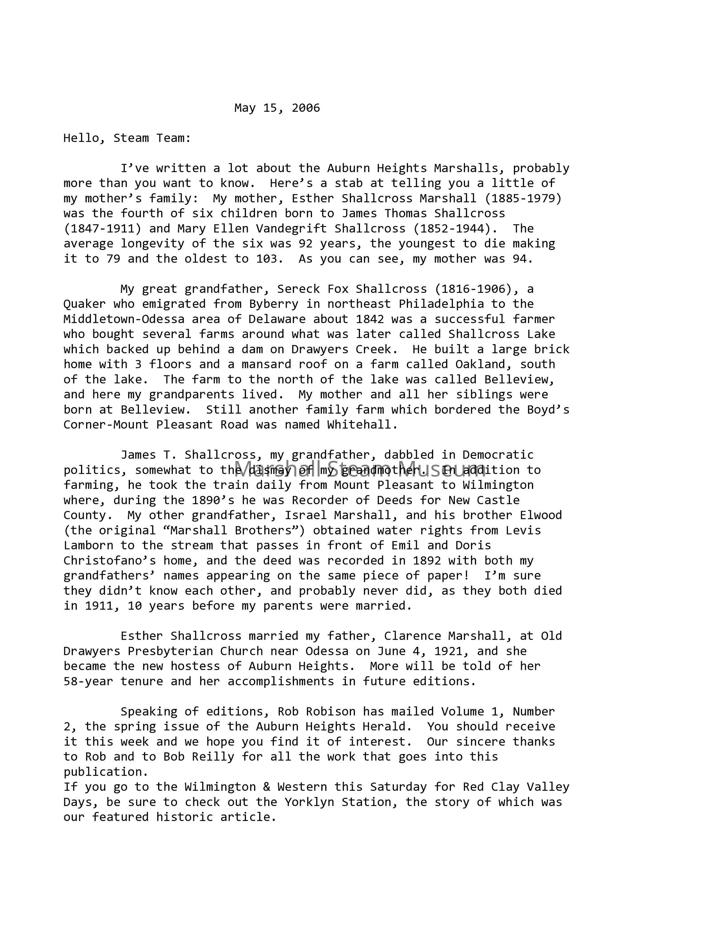 Esther Shallcross married my father, Clarence Marshall, at Old Drawyers Presbyterian Church near Odessa on June 4, 1921, and she became the new hostess of Auburn Heights. More will be told of her 58-year tenure and her accomplishments in future editions.