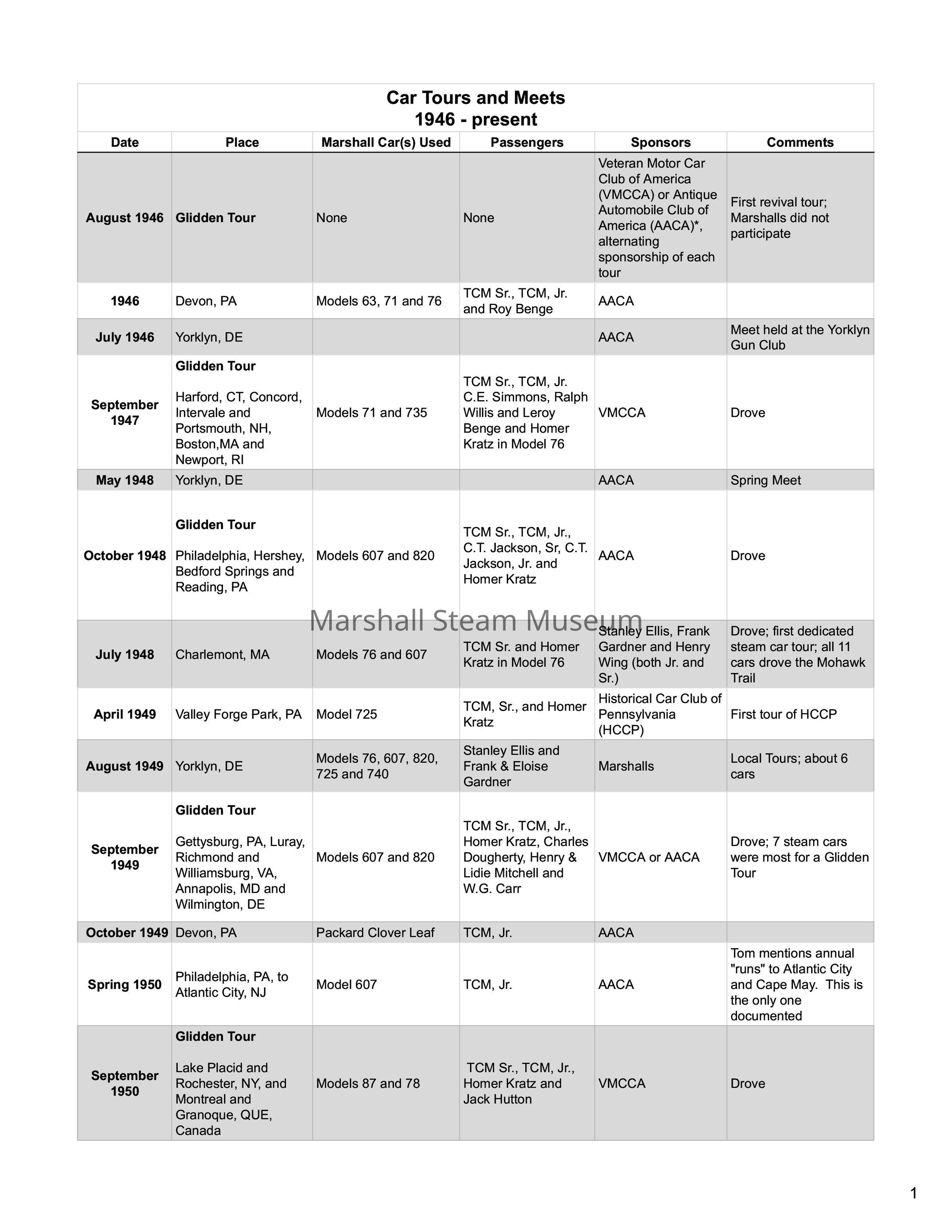 This summary is compiled from one handwritten and three typed lists written by Tom Marshall along with many of his Weekly News articles