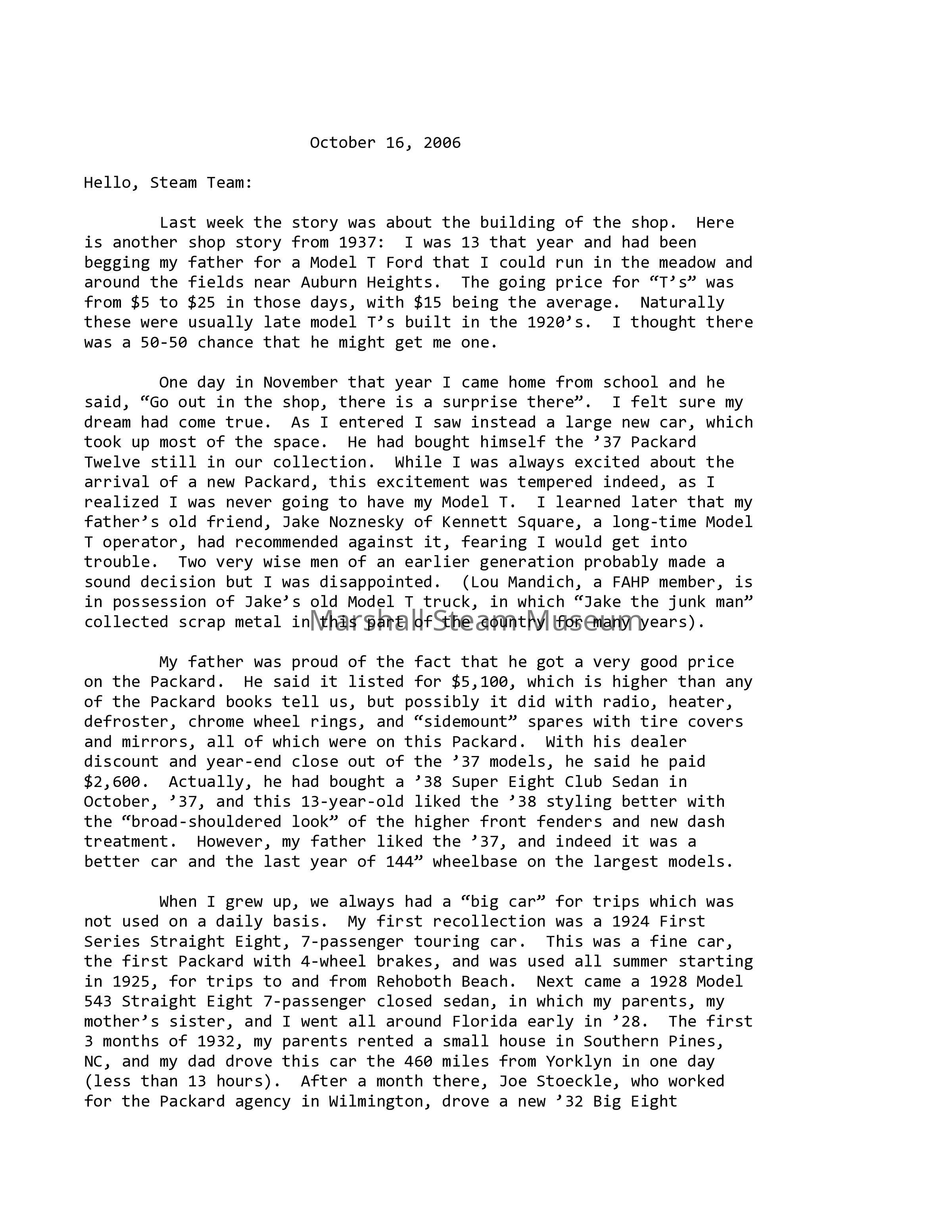 One day in November that year I came home from school and he said, “Go out in the shop, there is a surprise there”. I felt sure my dream had come true. As I entered I saw instead a large new car, which took up most of the space. He had bought himself the ’37 Packard Twelve still in our collection. While I was always excited about the arrival of a new Packard, this excitement was tempered indeed, as I realized I was never going to have my Model T. I learned later that my father’s old friend, Jake Noznesky of Kennett Square, a long-time Model T operator, had recommended against it, fearing I would get into trouble. Two very wise men of an earlier generation probably made a sound decision but I was disappointed. (Lou Mandich, a FAHP member, is in possession of Jake’s old Model T truck, in which “Jake the junk man” collected scrap metal in this part of the country for many years).