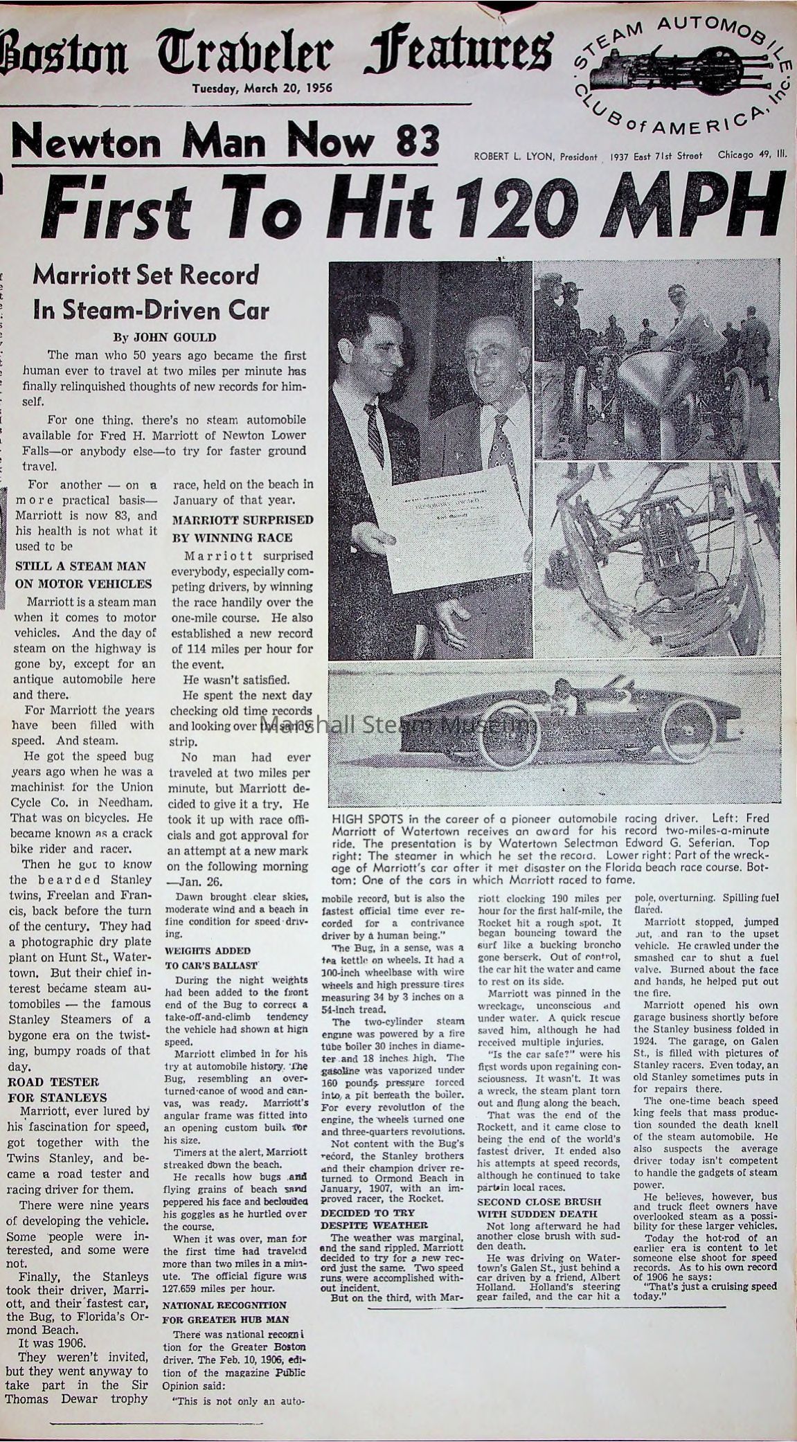 Photocopy of a 1956 Boston Traveler article reprint regarding the speed record set by Fred Marriott in 1906 in a Stanley steam car.