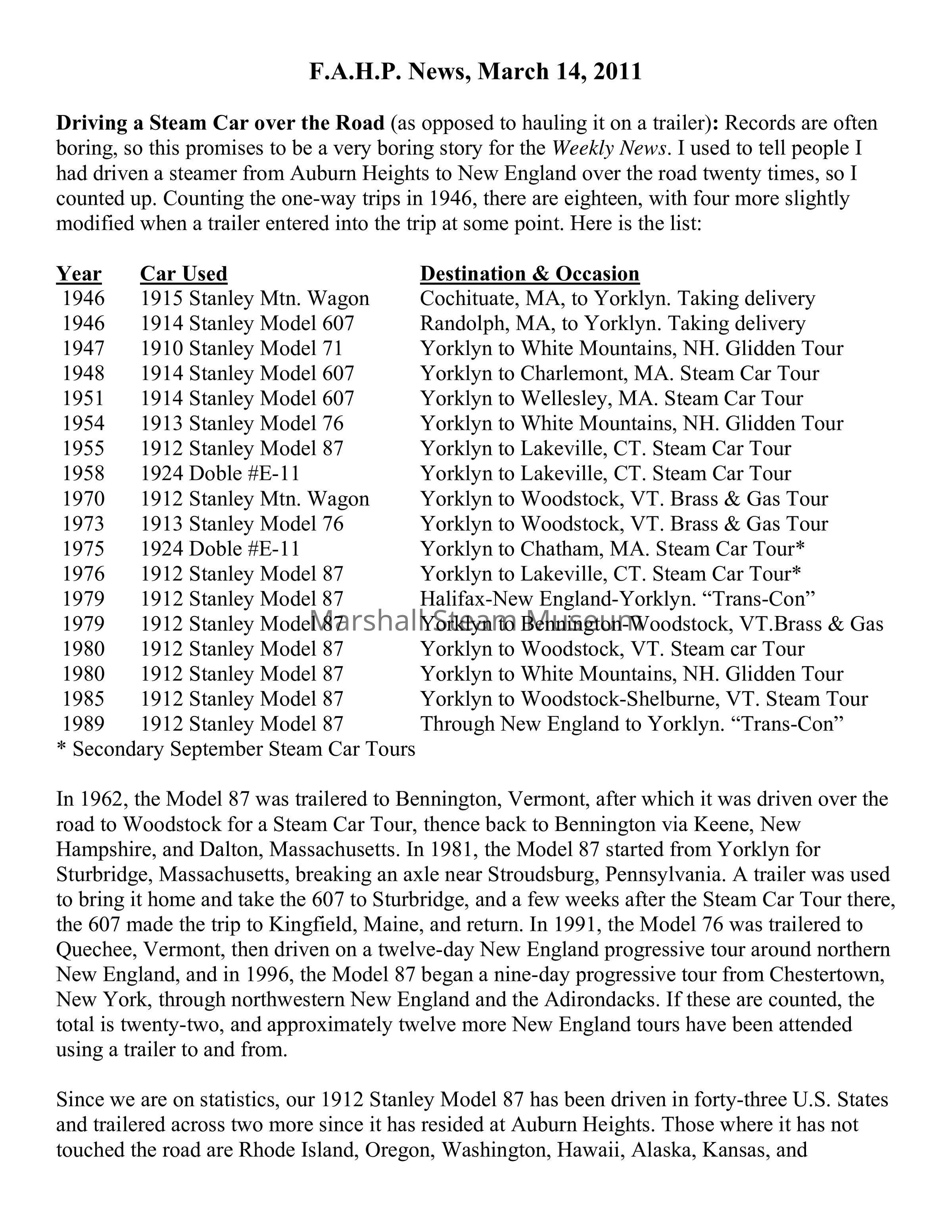 In 1962, the Model 87 was trailered to Bennington, Vermont, after which it was driven over the road to Woodstock for a Steam Car Tour, thence back to Bennington via Keene, New Hampshire, and Dalton, Massachusetts. In 1981, the Model 87 started from Yorklyn for Sturbridge, Massachusetts, breaking an axle near Stroudsburg, Pennsylvania. A trailer was used to bring it home and take the 607 to Sturbridge, and a few weeks after the Steam Car Tour there, the 607 made the trip to Kingfield, Maine, and return. In 1991, the Model 76 was trailered to Quechee, Vermont, then driven on a twelve-day New England progressive tour around northern New England, and in 1996, the Model 87 began a nine-day progressive tour from Chestertown, New York, through northwestern New England and the Adirondacks. If these are counted, the total is twenty-two, and approximately twelve more New England tours have been attended using a trailer to and from.