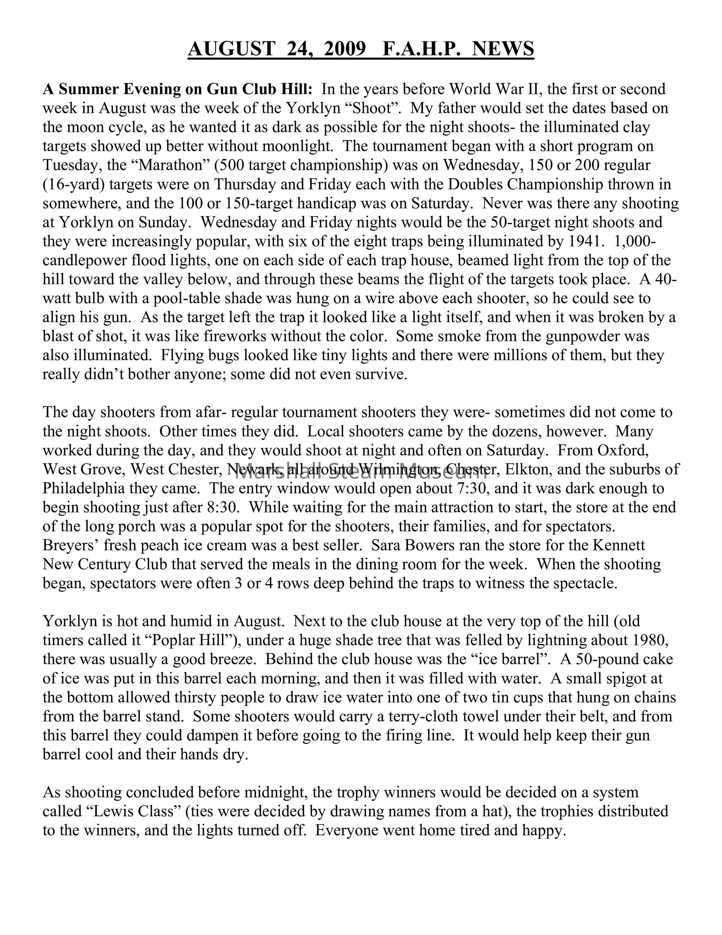 A Summer Evening on Gun Club Hill: In the years before World War II, the first or second week in August was the week of the Yorklyn “Shoot”. My father would set the dates based on the moon cycle, as he wanted it as dark as possible for the night shoots- the illuminated clay targets showed up better without moonlight. The tournament began with a short program on Tuesday, the “Marathon” (500 target championship) was on Wednesday, 150 or 200 regular (16-yard) targets were on Thursday and Friday each with the Doubles Championship thrown in somewhere, and the 100 or 150-target handicap was on Saturday. Never was there any shooting at Yorklyn on Sunday. Wednesday and Friday nights would be the 50-target night shoots and they were increasingly popular, with six of the eight traps being illuminated by 1941. 1,000- candlepower flood lights, one on each side of each trap house, beamed light from the top of the hill toward the valley below, and through these beams the flight of the targets took place. A 40-watt bulb with a pool-table shade was hung on a wire above each shooter, so he could see to align his gun. As the target left the trap it looked like a light itself, and when it was broken by a blast of shot, it was like fireworks without the color. Some smoke from the gunpowder was also illuminated. Flying bugs looked like tiny lights and there were millions of them, but they really didn’t bother anyone; some did not even survive.